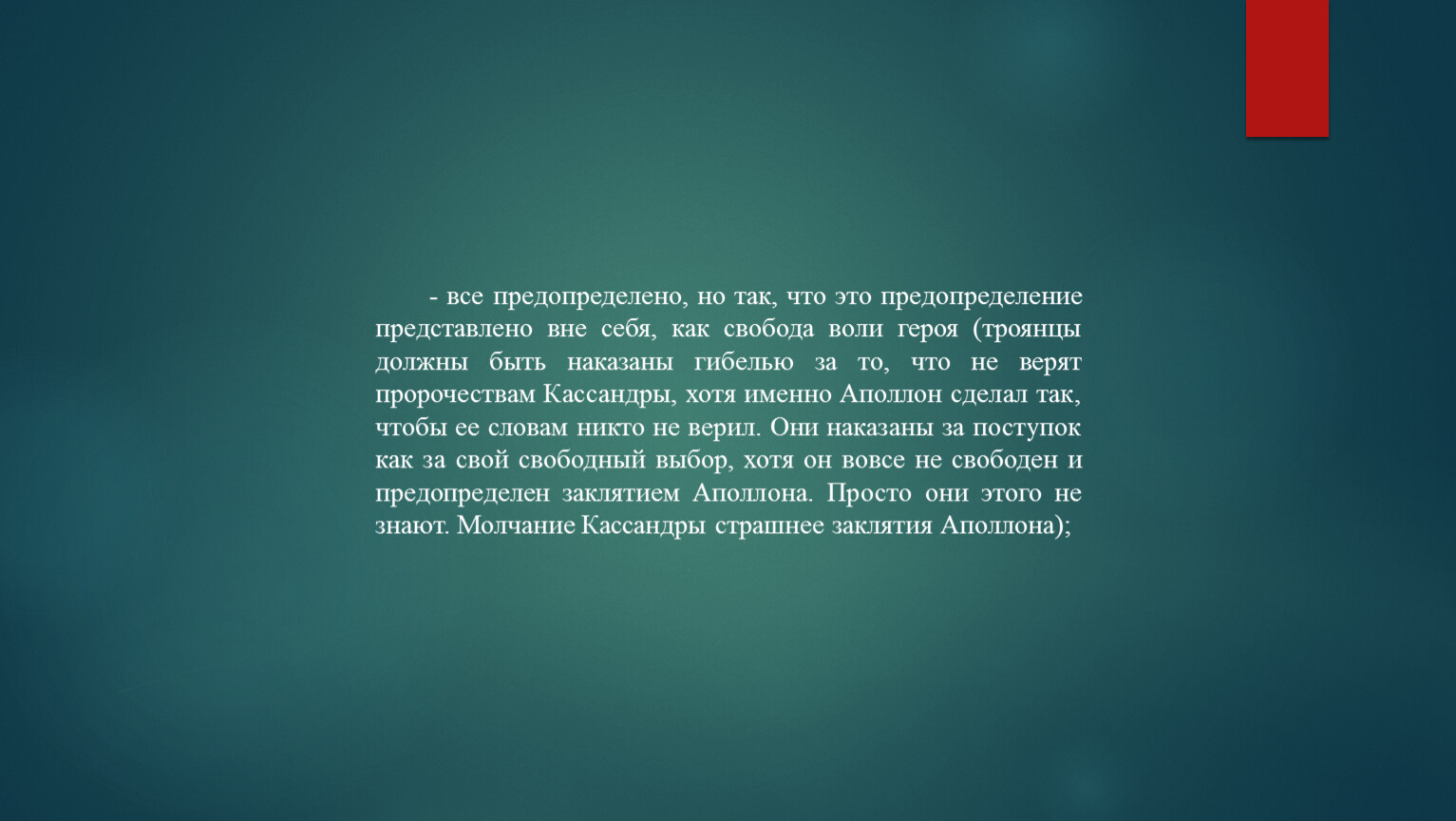 - все предопределено, но так, что это предопределение представлено вне себя, как свобода воли героя (троянцы должны быть наказаны гибелью за то, что не верят пророчествам Кассандры, хотя именно Аполлон сделал так, чтобы ее словам никто не верил. Они наказаны за поступок как за свой свободный выбор, хотя он вовсе не свободен и предопределен заклятием Аполлона. Просто они этого не знают. Молчание Кассандры страшнее заклятия Аполлона);