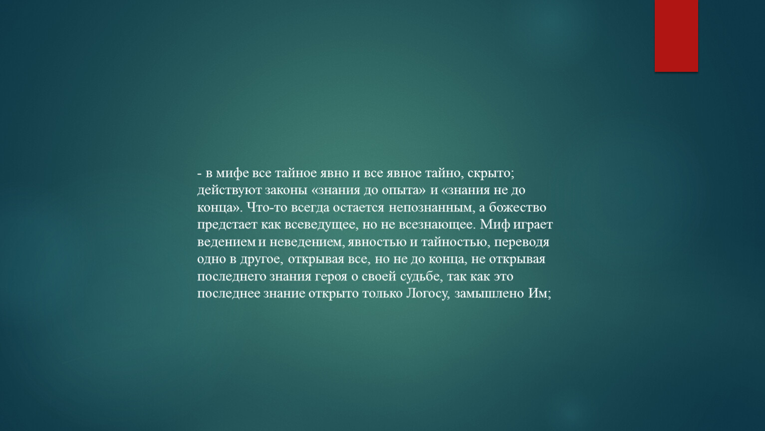 - в мифе все тайное явно и все явное тайно, скрыто; действуют законы «знания до опыта» и «знания не до конца». Что-то всегда остается непознанным, а божество предстает как всеведущее, но не всезнающее. Миф играет ведением и неведением, явностью и тайностью, переводя одно в другое, открывая все, но не до конца, не открывая последнего знания героя о своей судьбе, так как это последнее знание открыто только Логосу, замышлено Им;