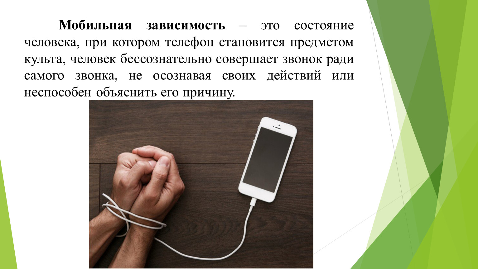 Мобильная зависимость – это состояние человека, при котором телефон становится предметом культа, человек бессознательно совершает звонок ради самого звонка, не осознавая своих действий или неспособен объяснить его причину.