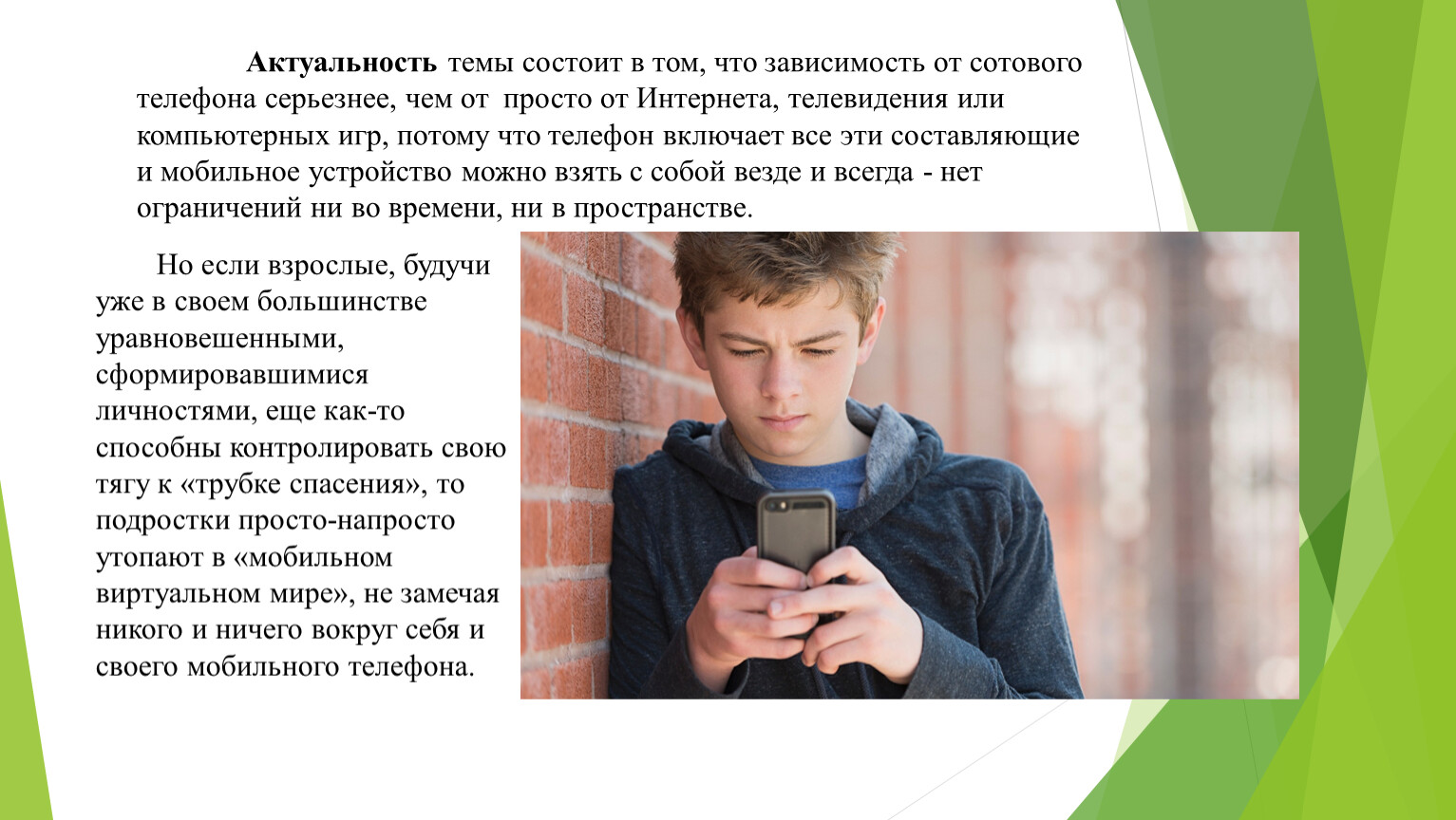 Актуальность темы состоит в том, что зависимость от сотового телефона серьезнее, чем от просто от Интернета, телевидения или компьютерных игр, потому что телефон включает все эти составляющие и мобильное устройство можно взять с собой везде и всегда - нет ограничений ни во времени, ни в пространстве.