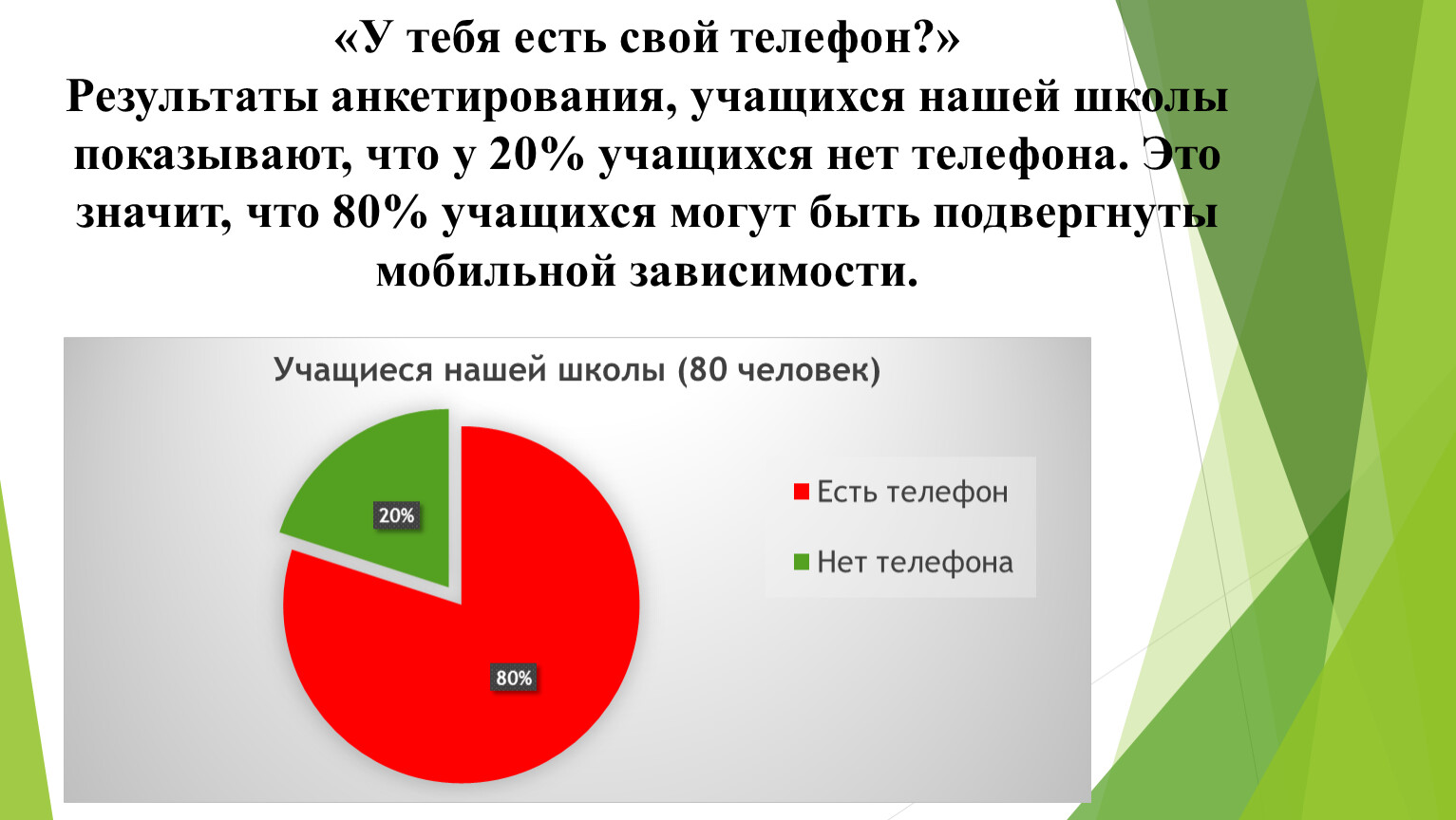 «У тебя есть свой телефон?»Результаты анкетирования, учащихся нашей школы показывают, что у 20% учащихся нет телефона. Это значит, что 80% учащихся могут быть подвергнуты мобильной зависимости.
