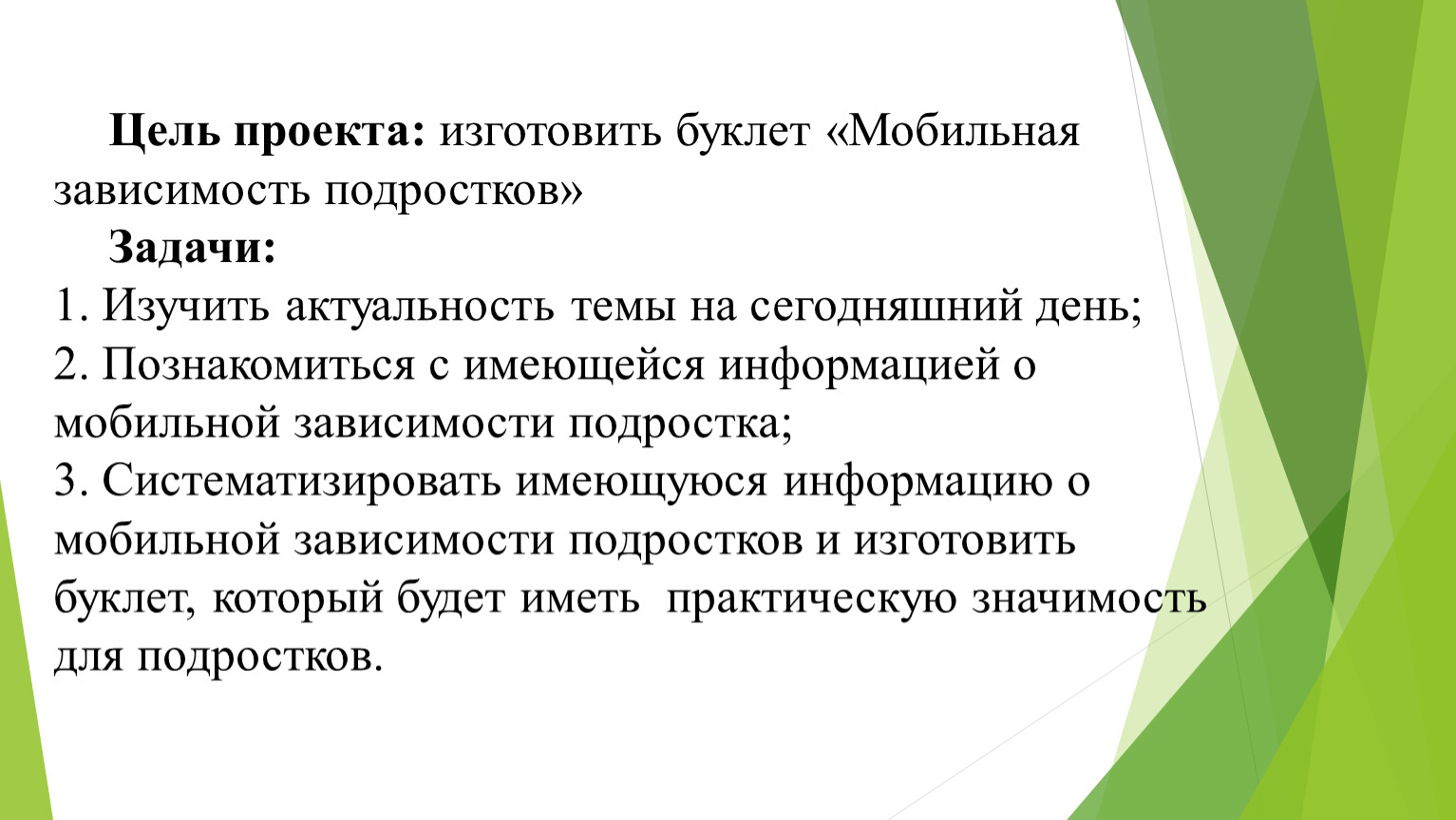 Цель проекта: изготовить буклет «Мобильная зависимость подростков» Задачи:1. Изучить актуальность темы на сегодняшний день;2. Познакомиться с имеющейся информацией о мобильной зависимости подростка;3. Систематизировать имеющуюся информацию о мобильной зависимости подростков и изготовить буклет, который будет иметь практическую значимость для подростков.