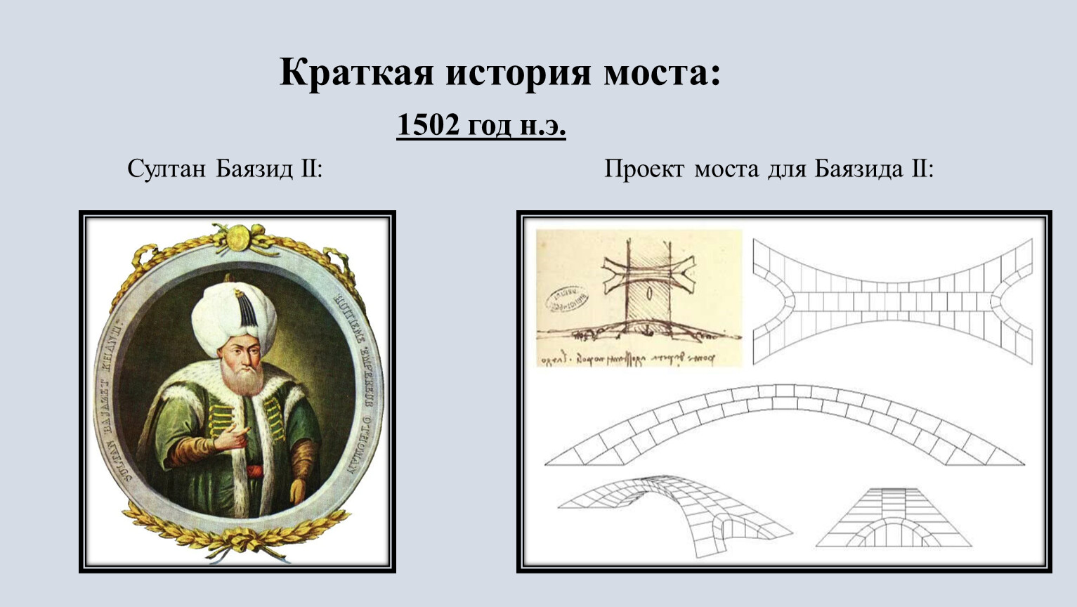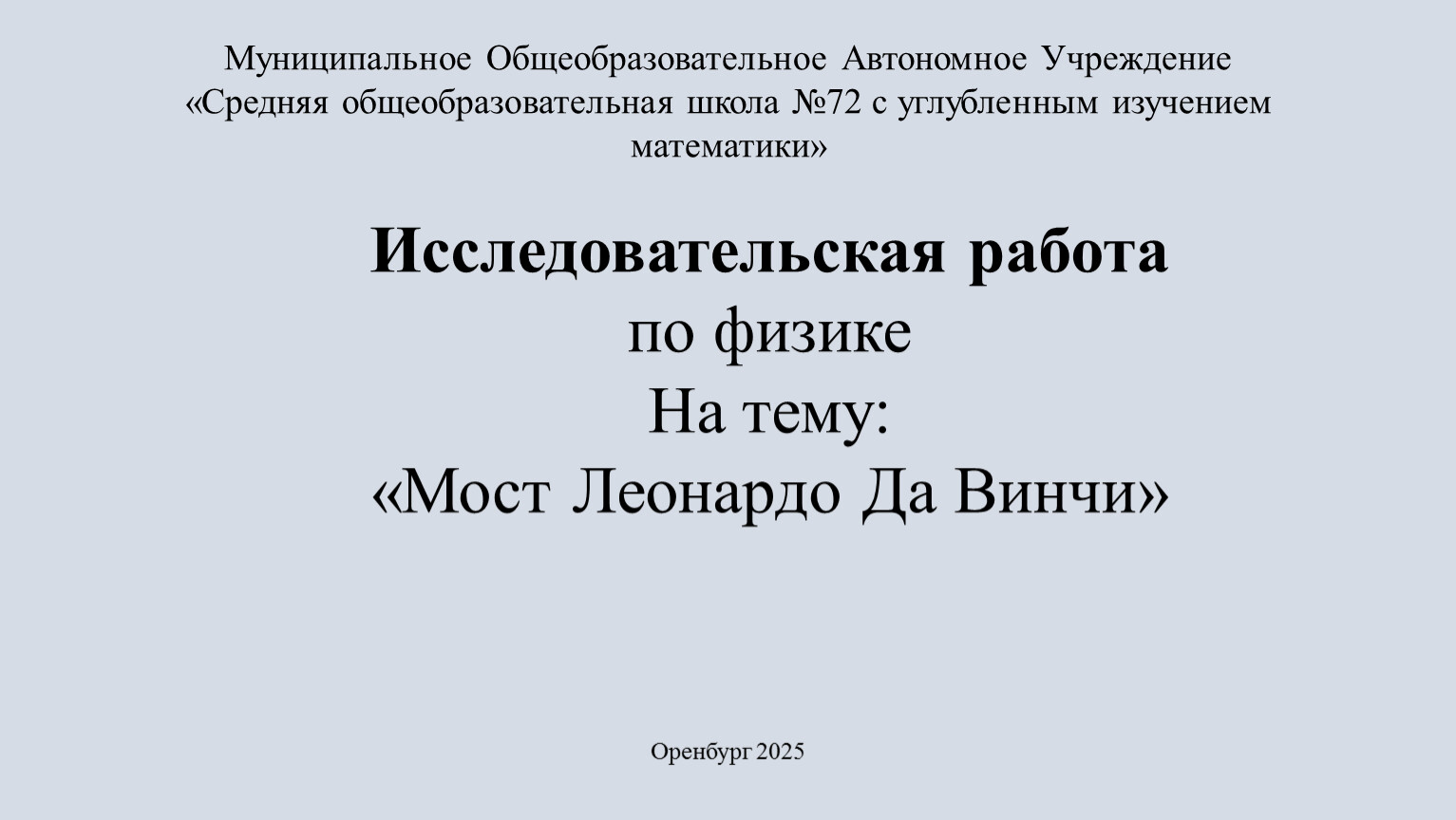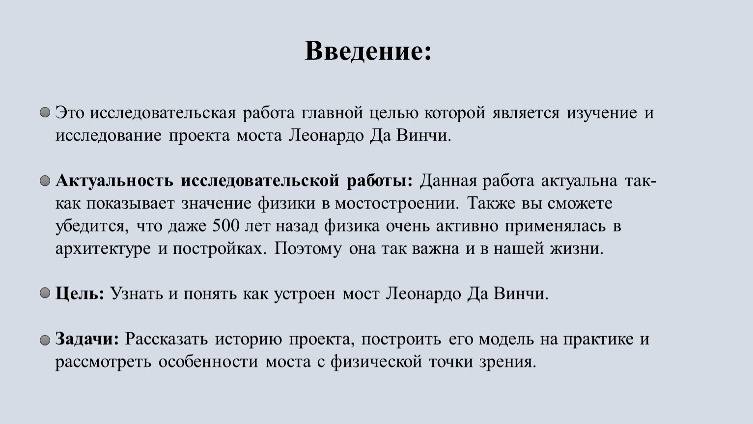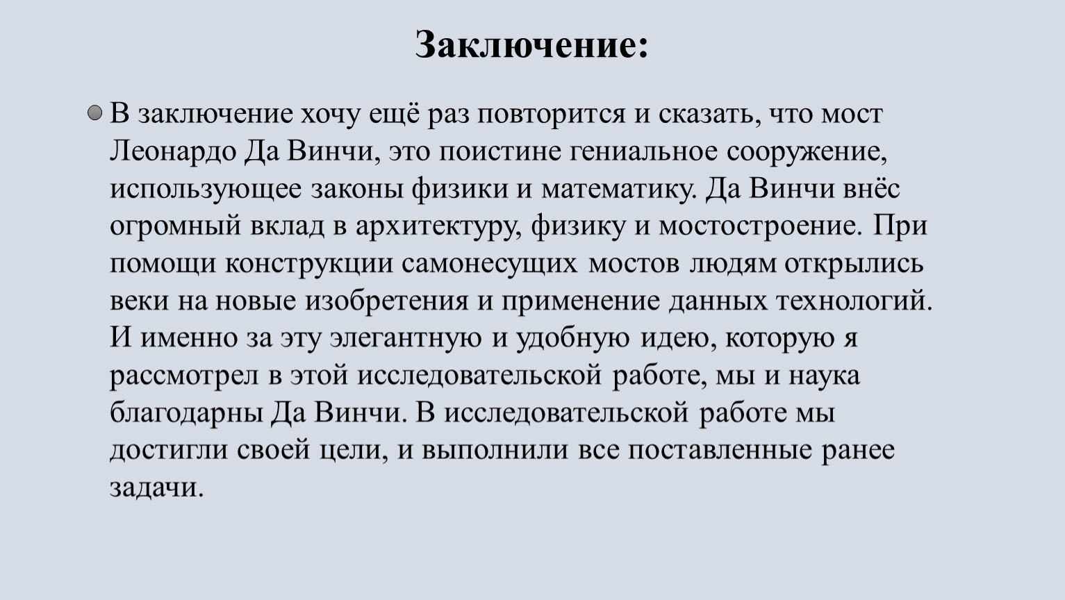 В заключение хочу ещё раз повторится и сказать, что мост Леонардо Да Винчи, это поистине гениальное сооружение, использующее законы физики и математику. Да Винчи внёс огромный вклад в архитектуру, физику и мостостроение. При помощи конструкции самонесущих мостов людям открылись веки на новые изобретения и применение данных технологий. И именно за эту элегантную и удобную идею, которую я рассмотрел в этой исследовательской работе, мы и наука благодарны Да Винчи. В исследовательской работе мы достигли своей цели, и выполнили все поставленные ранее задачи.