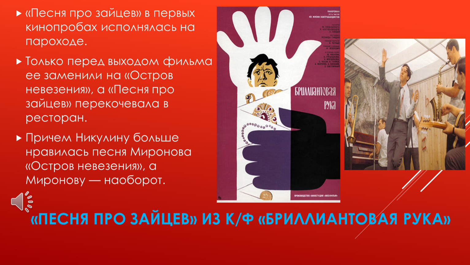 Только перед выходом фильма ее заменили на «Остров невезения», а «Песня про зайцев» перекочевала в ресторан.