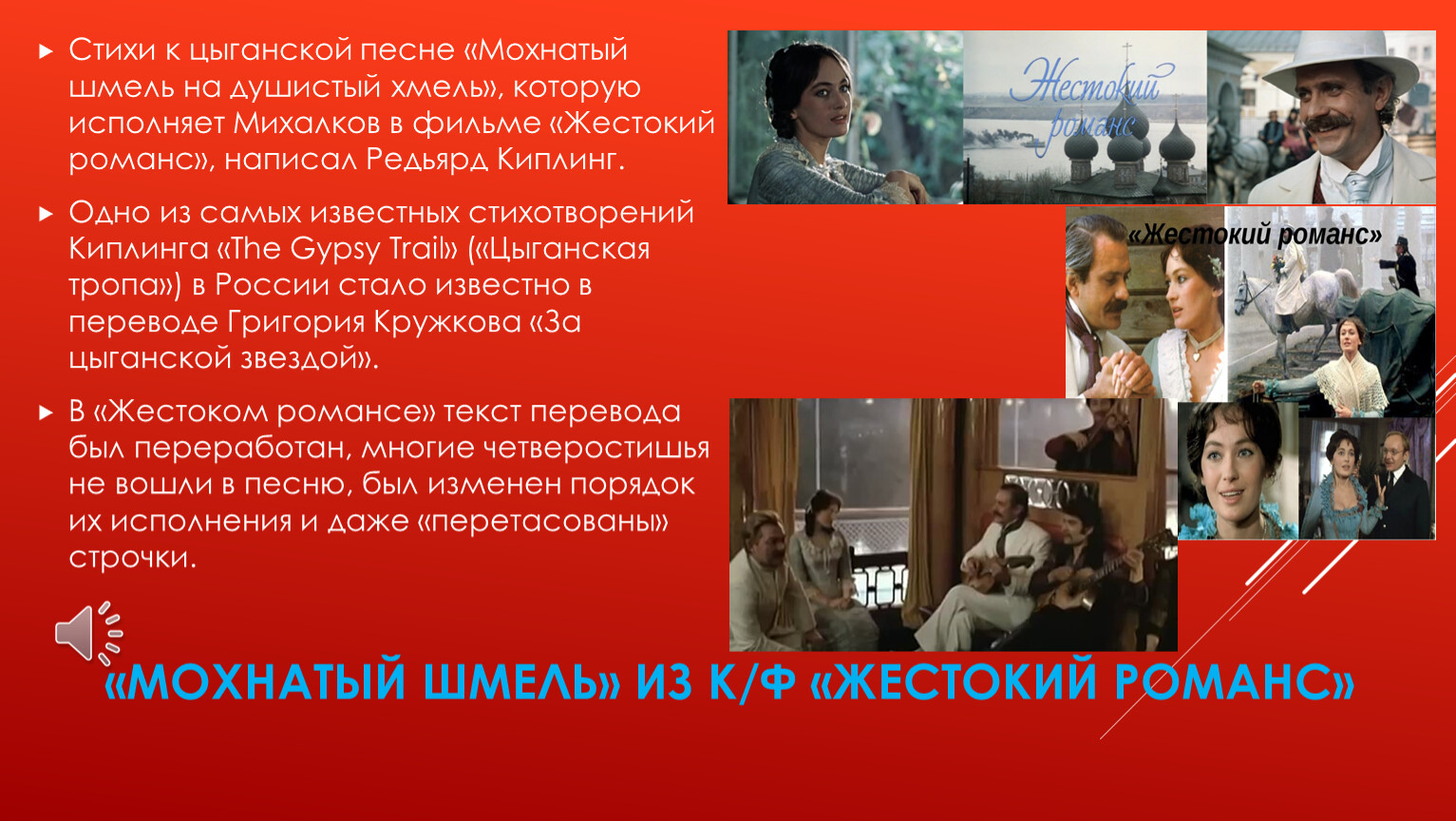 Стихи к цыганской песне «Мохнатый шмель на душистый хмель», которую исполняет Михалков в фильме «Жестокий романс», написал Редьярд Киплинг.