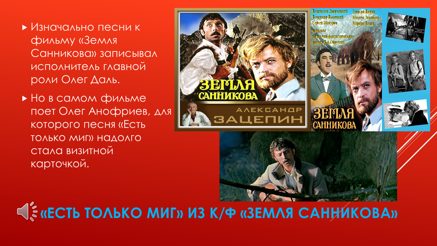 Но в самом фильме поет Олег Анофриев, для которого песня «Есть только миг» надолго стала визитной карточкой.