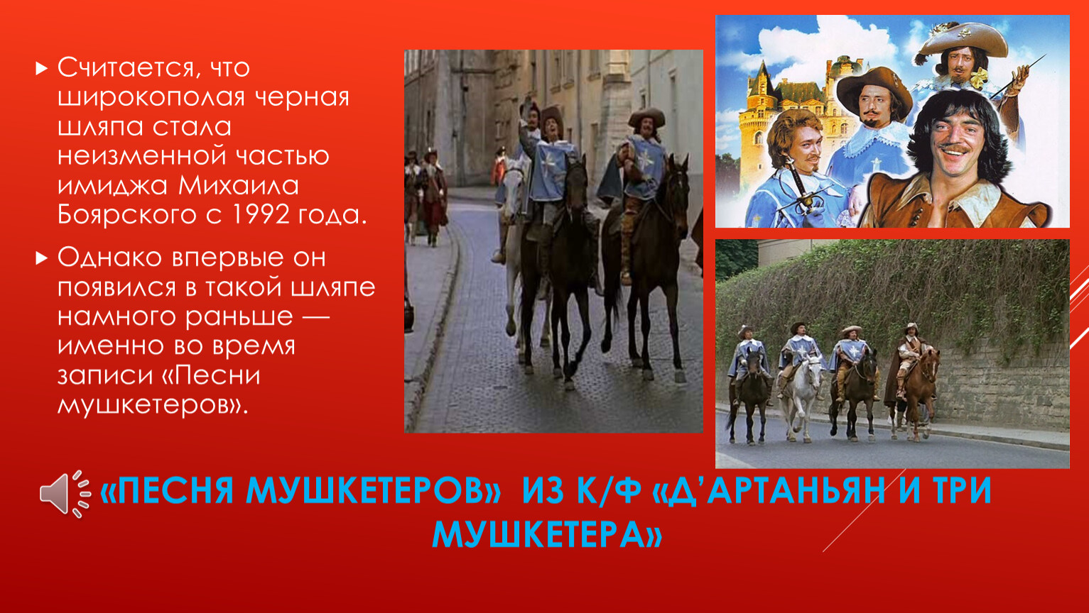 Однако впервые он появился в такой шляпе намного раньше — именно во время записи «Песни мушкетеров».
