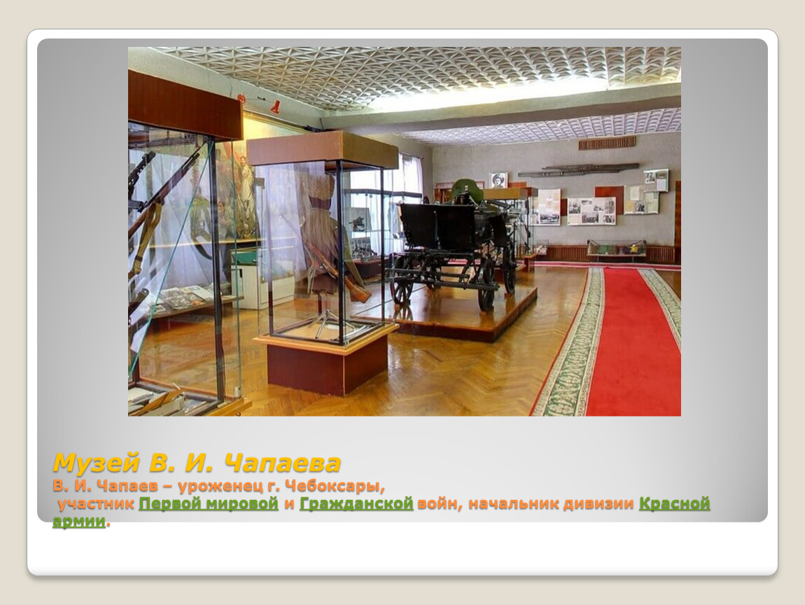 Музей В. И. ЧапаеваВ. И. Чапаев – уроженец г. Чебоксары, участник Первой мировой и Гражданской войн, начальник дивизии Красной армии.
