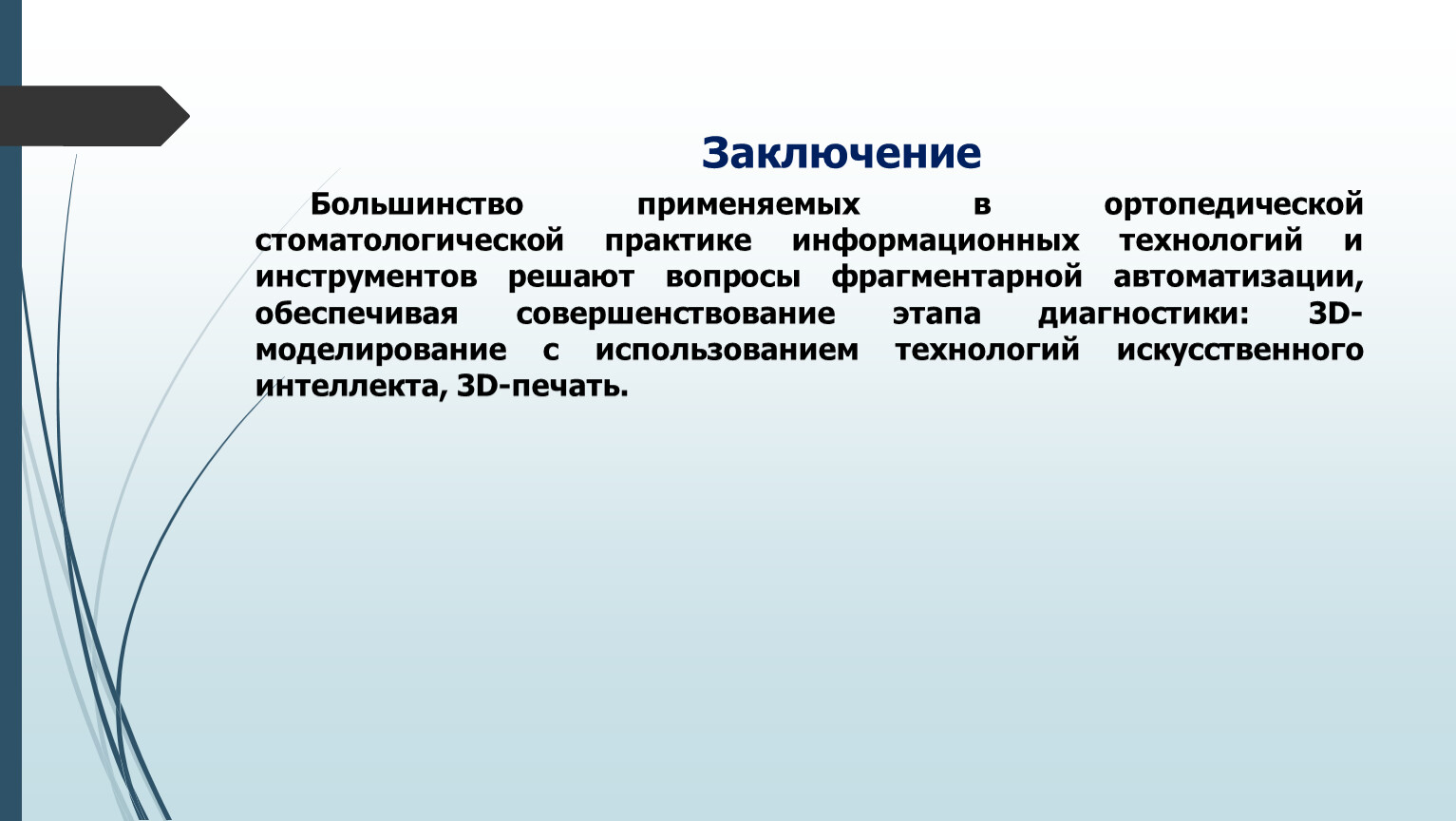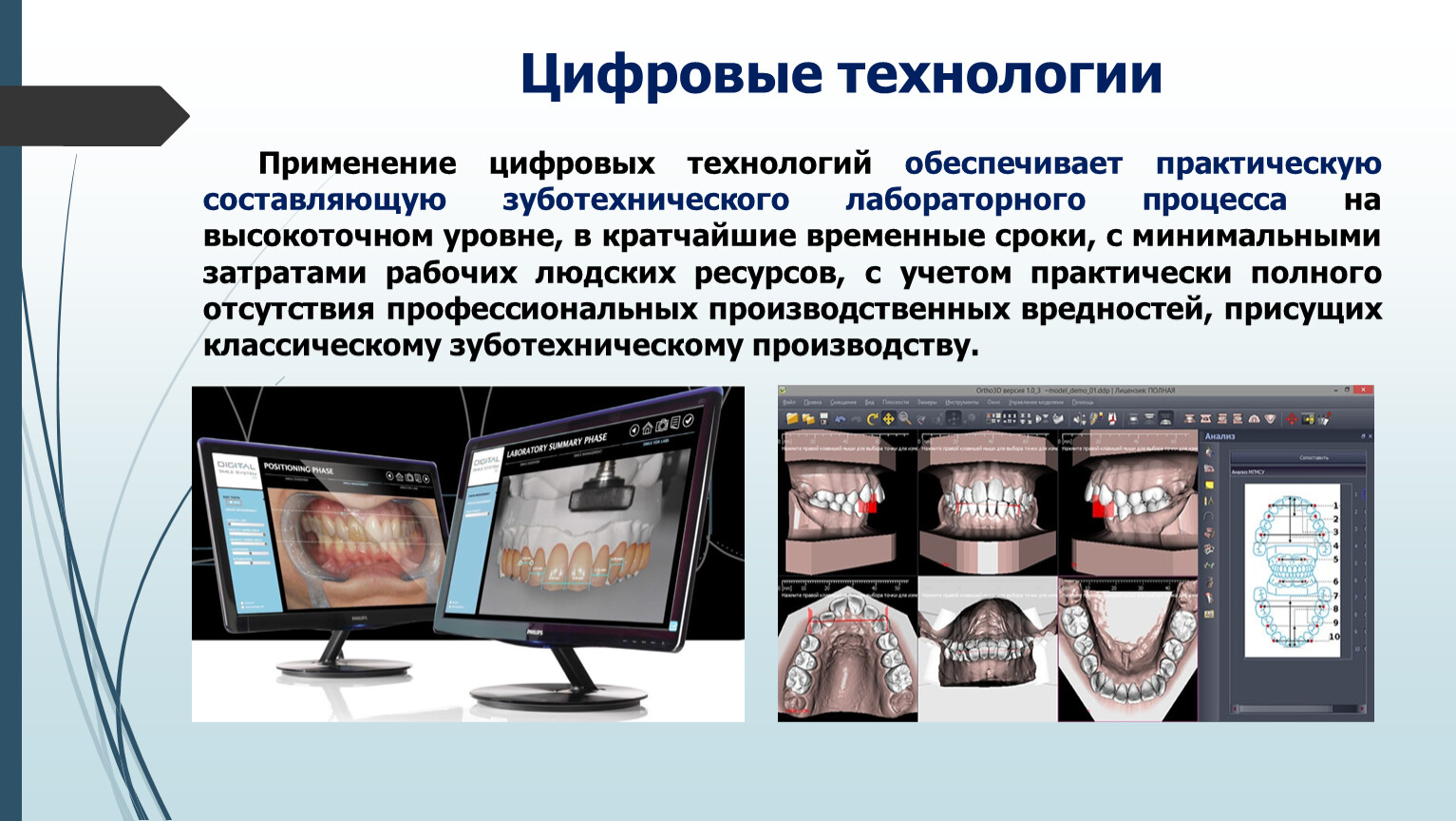 Применение цифровых технологий обеспечивает практическую составляющую зуботехнического лабораторного процесса на высокоточном уровне, в кратчайшие временные сроки, с минимальными затратами рабочих людских ресурсов, с учетом практически полного отсутствия профессиональных производственных вредностей, присущих классическому зуботехническому производству.