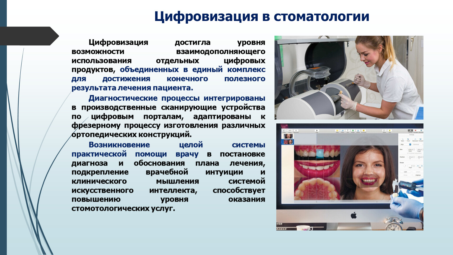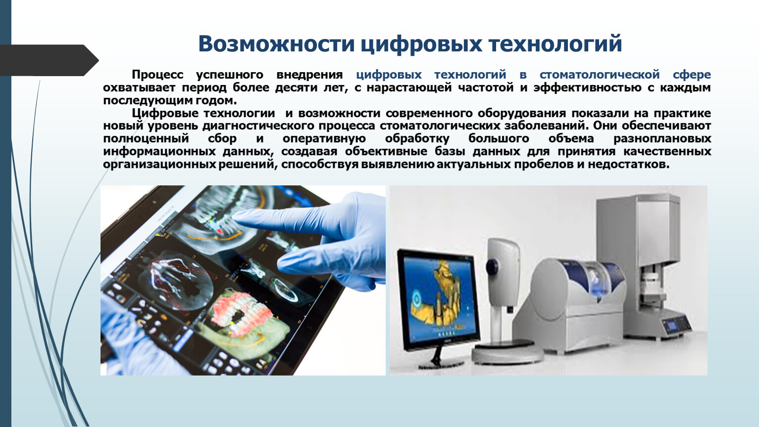 Цифровые технологии и возможности современного оборудования показали на практике новый уровень диагностического процесса стоматологических заболеваний. Они обеспечивают полноценный сбор и оперативную обработку большого объема разноплановых информационных данных, создавая объективные базы данных для принятия качественных организационных решений, способствуя выявлению актуальных пробелов и недостатков.