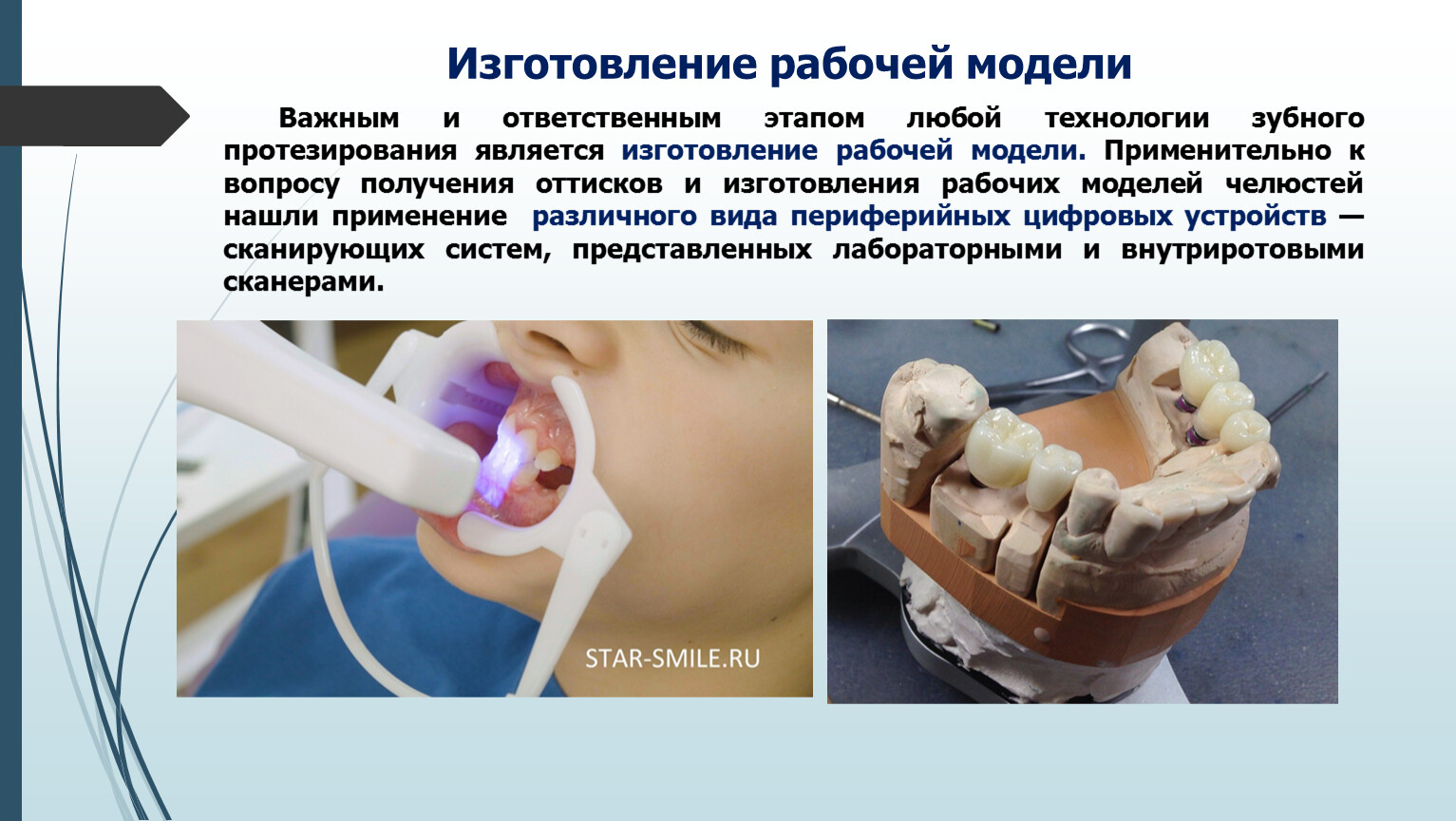 Важным и ответственным этапом любой технологии зубного протезирования является изготовление рабочей модели. Применительно к вопросу получения оттисков и изготовления рабочих моделей челюстей нашли применение различного вида периферийных цифровых устройств — сканирующих систем, представленных лабораторными и внутриротовыми сканерами.