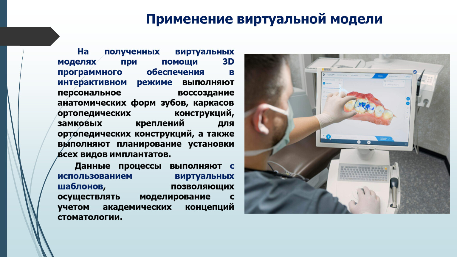 На полученных виртуальных моделях при помощи 3D программного обеспечения в интерактивном режиме выполняют персональное воссоздание анатомических форм зубов, каркасов ортопедических конструкций, замковых креплений для ортопедических конструкций, а также выполняют планирование установки всех видов имплантатов.