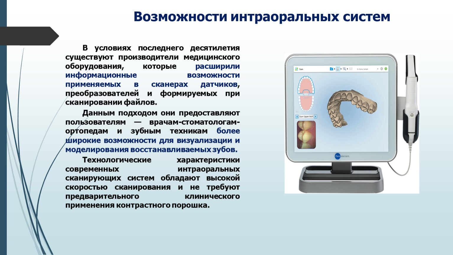 Технологические характеристики современных интраоральных сканирующих систем обладают высокой скоростью сканирования и не требуют предварительного клинического применения контрастного порошка.