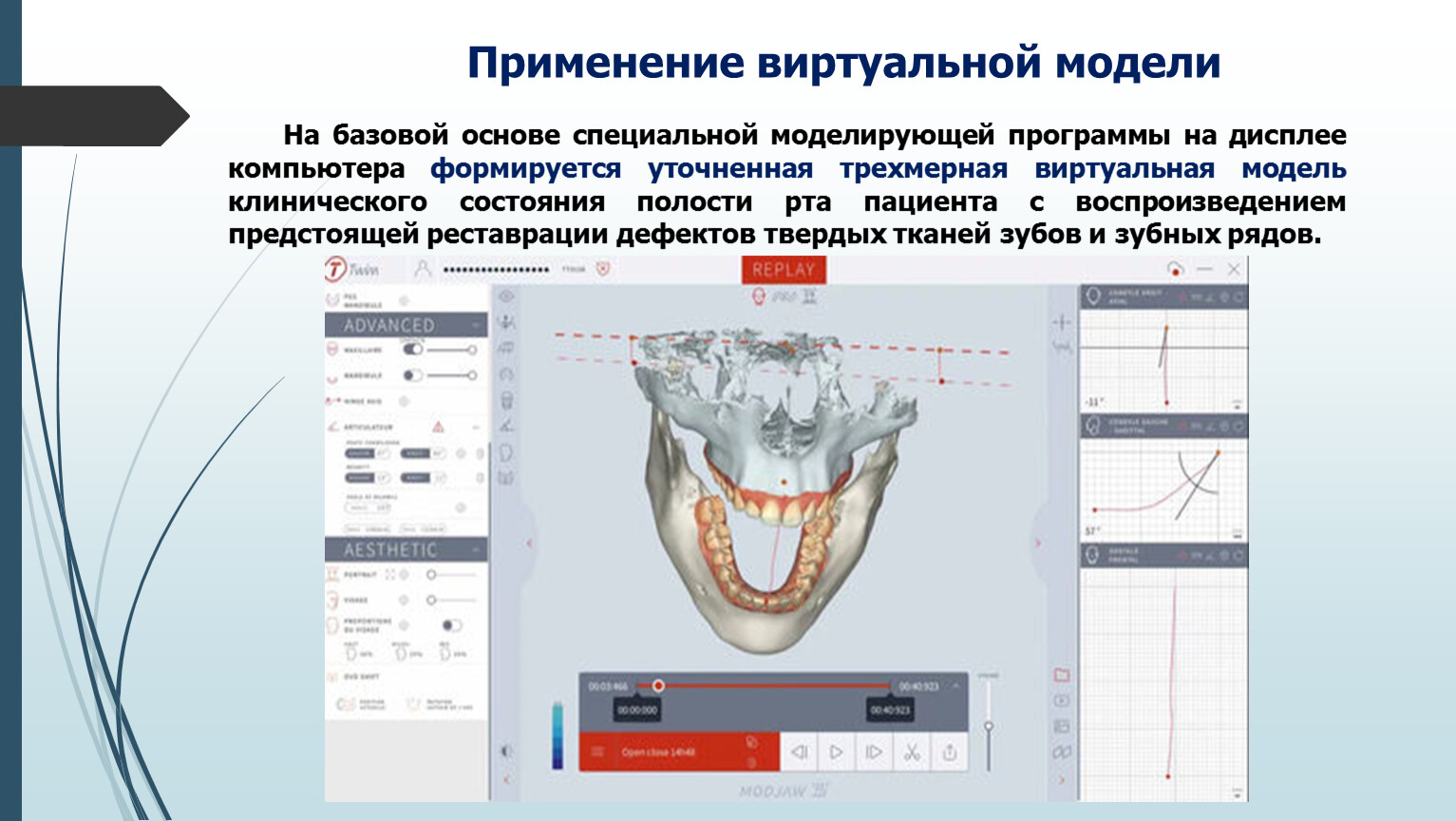 На базовой основе специальной моделирующей программы на дисплее компьютера формируется уточненная трехмерная виртуальная модель клинического состояния полости рта пациента с воспроизведением предстоящей реставрации дефектов твердых тканей зубов и зубных рядов.