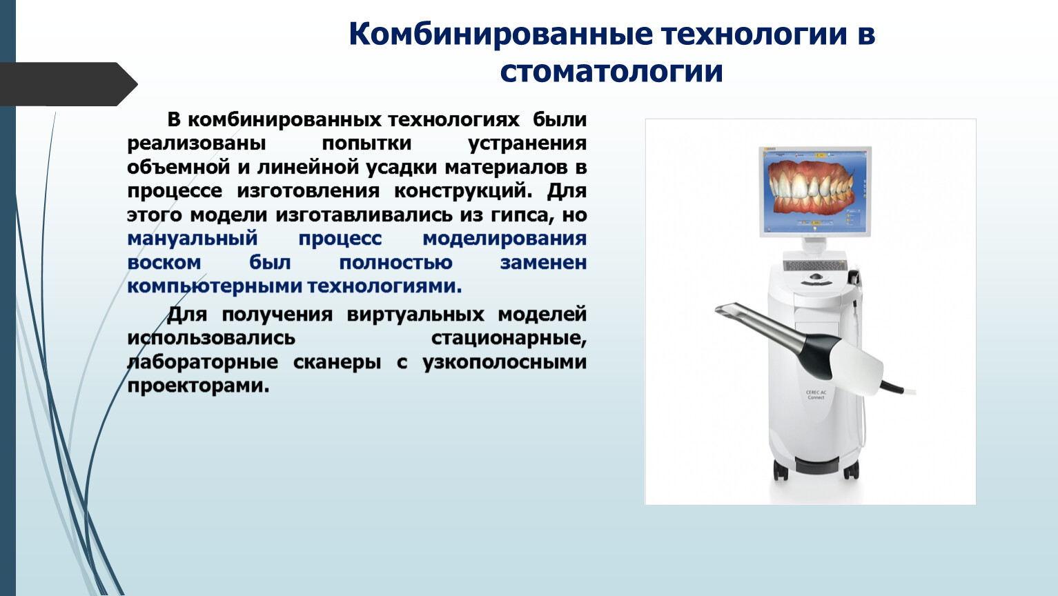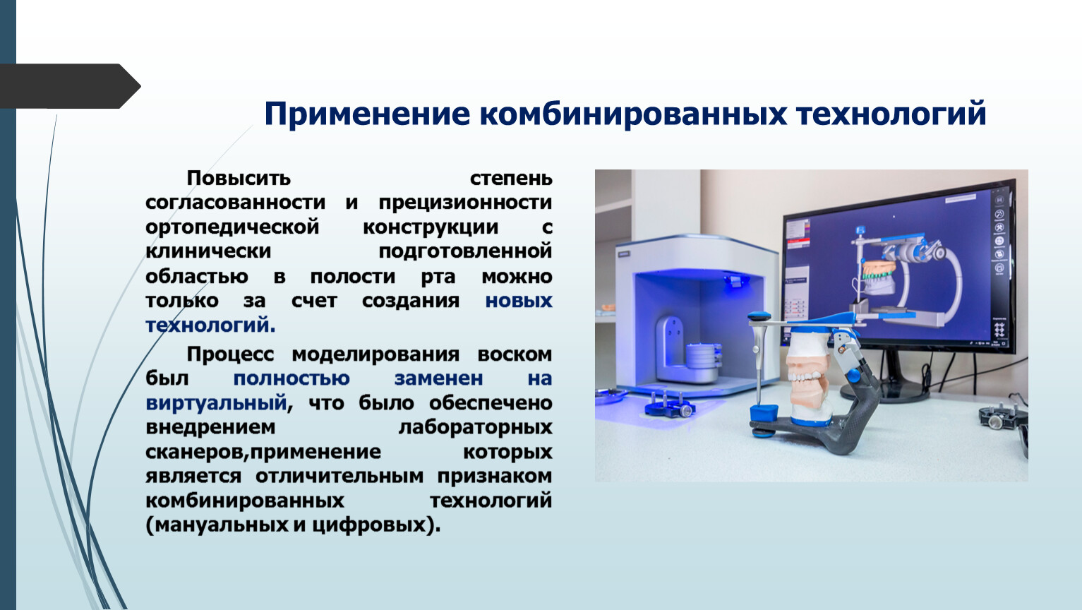 Процесс моделирования воском был полностью заменен на виртуальный, что было обеспечено внедрением лабораторных сканеров,применение которых является отличительным признаком комбинированных технологий (мануальных и цифровых).
