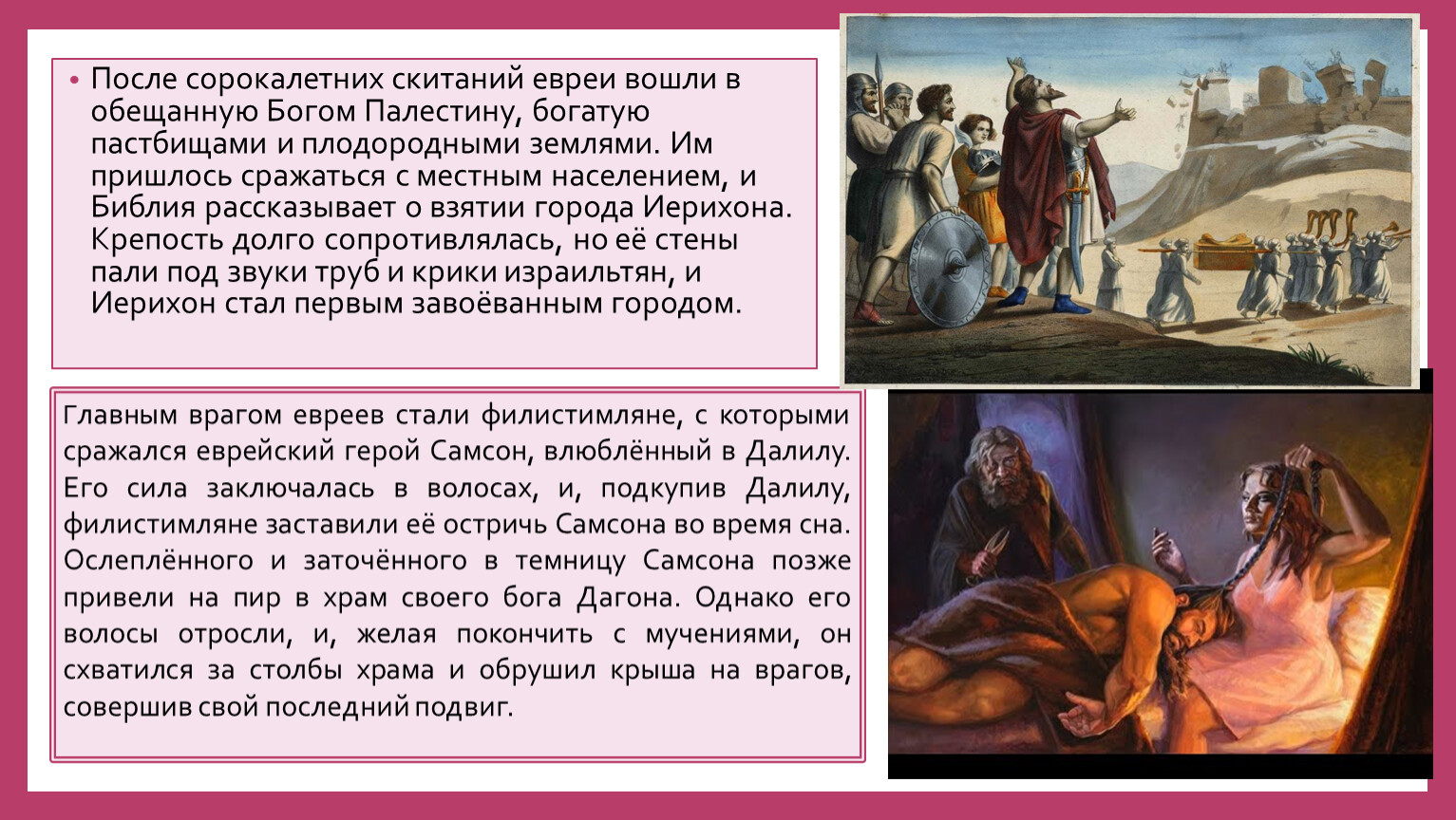 Главным врагом евреев стали филистимляне, с которыми сражался еврейский герой Самсон, влюблённый в Далилу. Его сила заключалась в волосах, и, подкупив Далилу, филистимляне заставили её остричь Самсона во время сна. Ослеплённого и заточённого в темницу Самсона позже привели на пир в храм своего бога Дагона. Однако его волосы отросли, и, желая покончить с мучениями, он схватился за столбы храма и обрушил крыша на врагов, совершив свой последний подвиг.