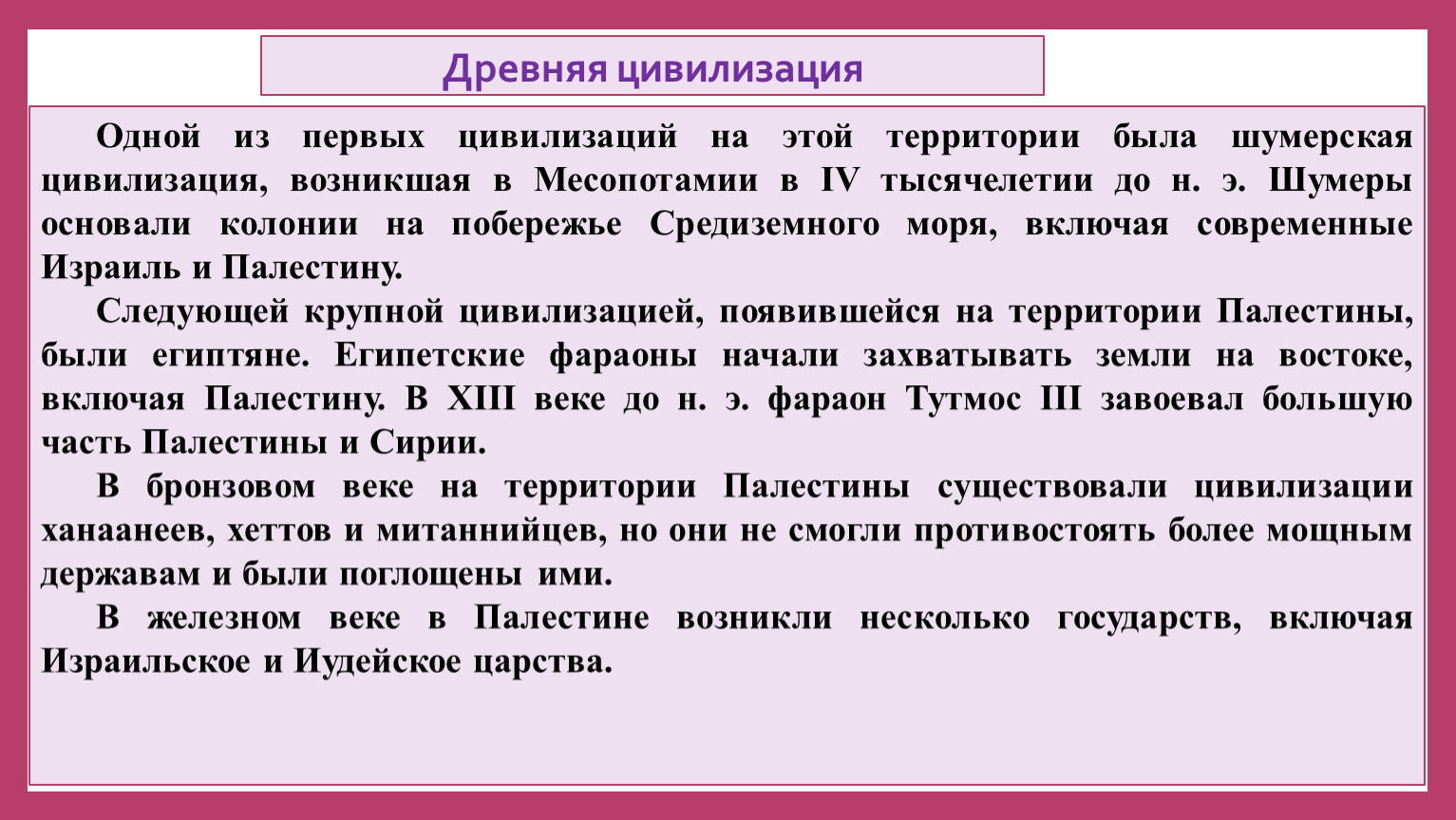 Одной из первых цивилизаций на этой территории была шумерская цивилизация, возникшая в Месопотамии в IV тысячелетии до н. э. Шумеры основали колонии на побережье Средиземного моря, включая современные Израиль и Палестину.