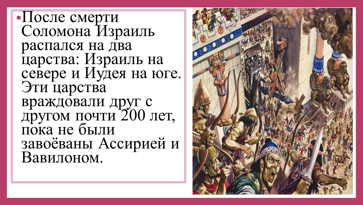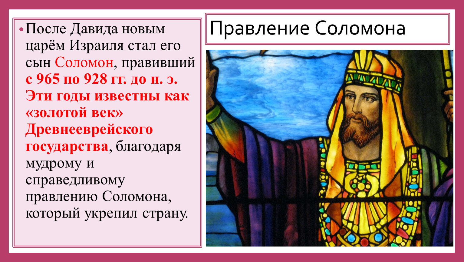 После Давида новым царём Израиля стал его сын Соломон, правивший с 965 по 928 гг. до н. э. Эти годы известны как «золотой век» Древнееврейского государства, благодаря мудрому и справедливому правлению Соломона, который укрепил страну.