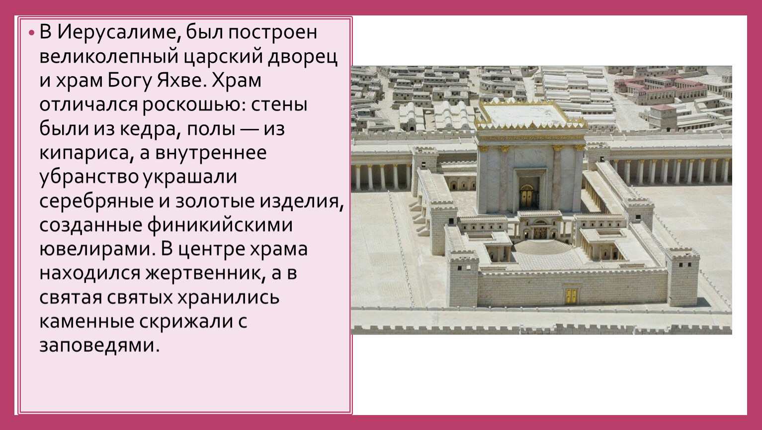 В Иерусалиме, был построен великолепный царский дворец и храм Богу Яхве. Храм отличался роскошью: стены были из кедра, полы — из кипариса, а внутреннее убранство украшали серебряные и золотые изделия, созданные финикийскими ювелирами. В центре храма находился жертвенник, а в святая святых хранились каменные скрижали с заповедями.