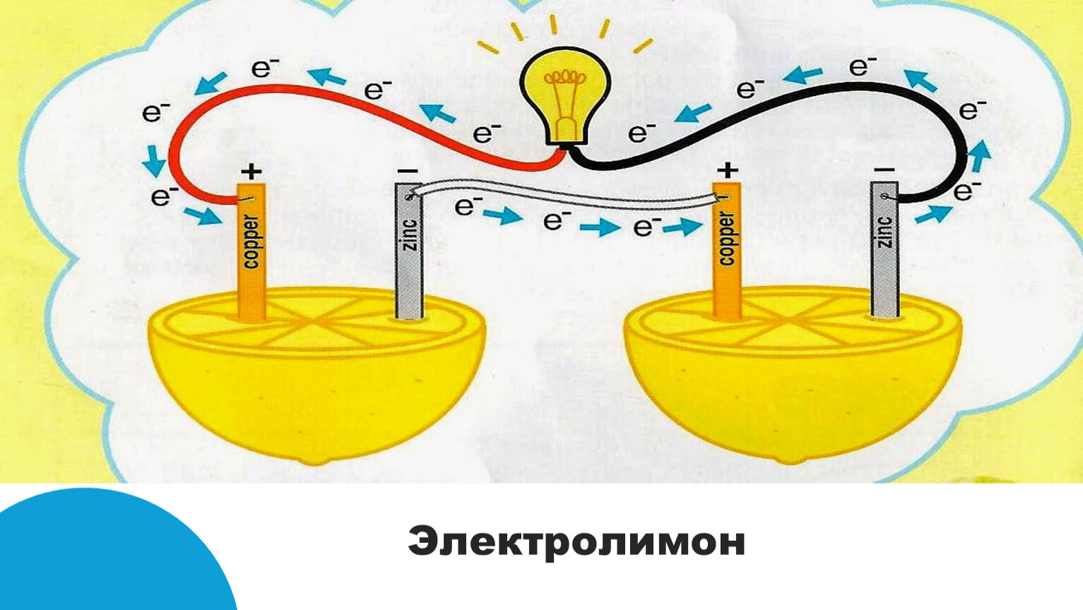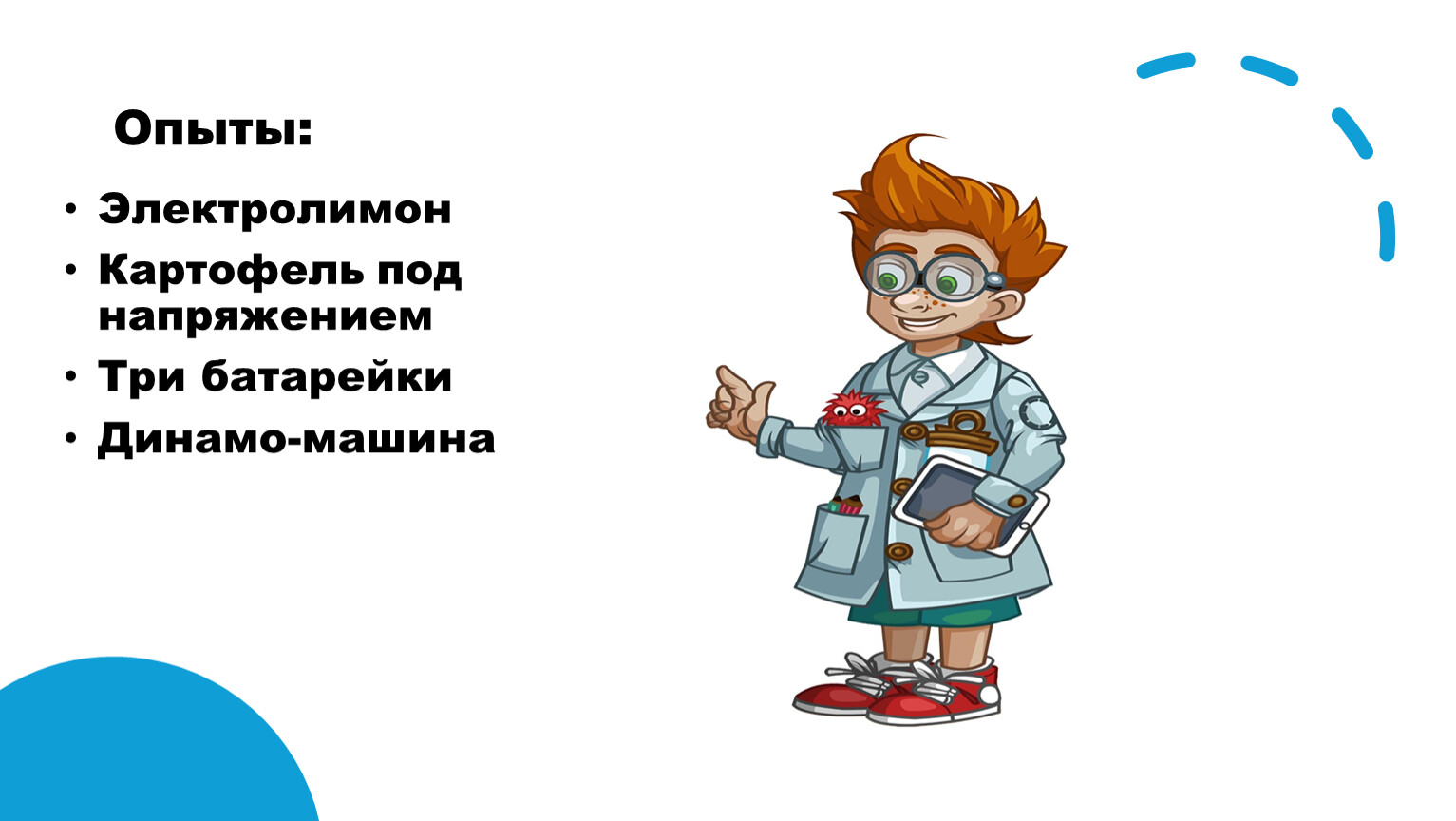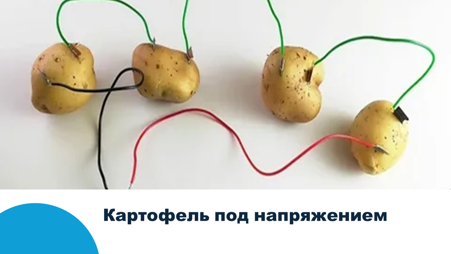 Оборудование: телевизор, ноутбук с приложением «Наураша», датчик «божья коровка» для измерения напряжения, цинковый и медный электроды, динамо-машина, лампочка на платформе, батарейный блок, батарея АА, апельсин, картофель.