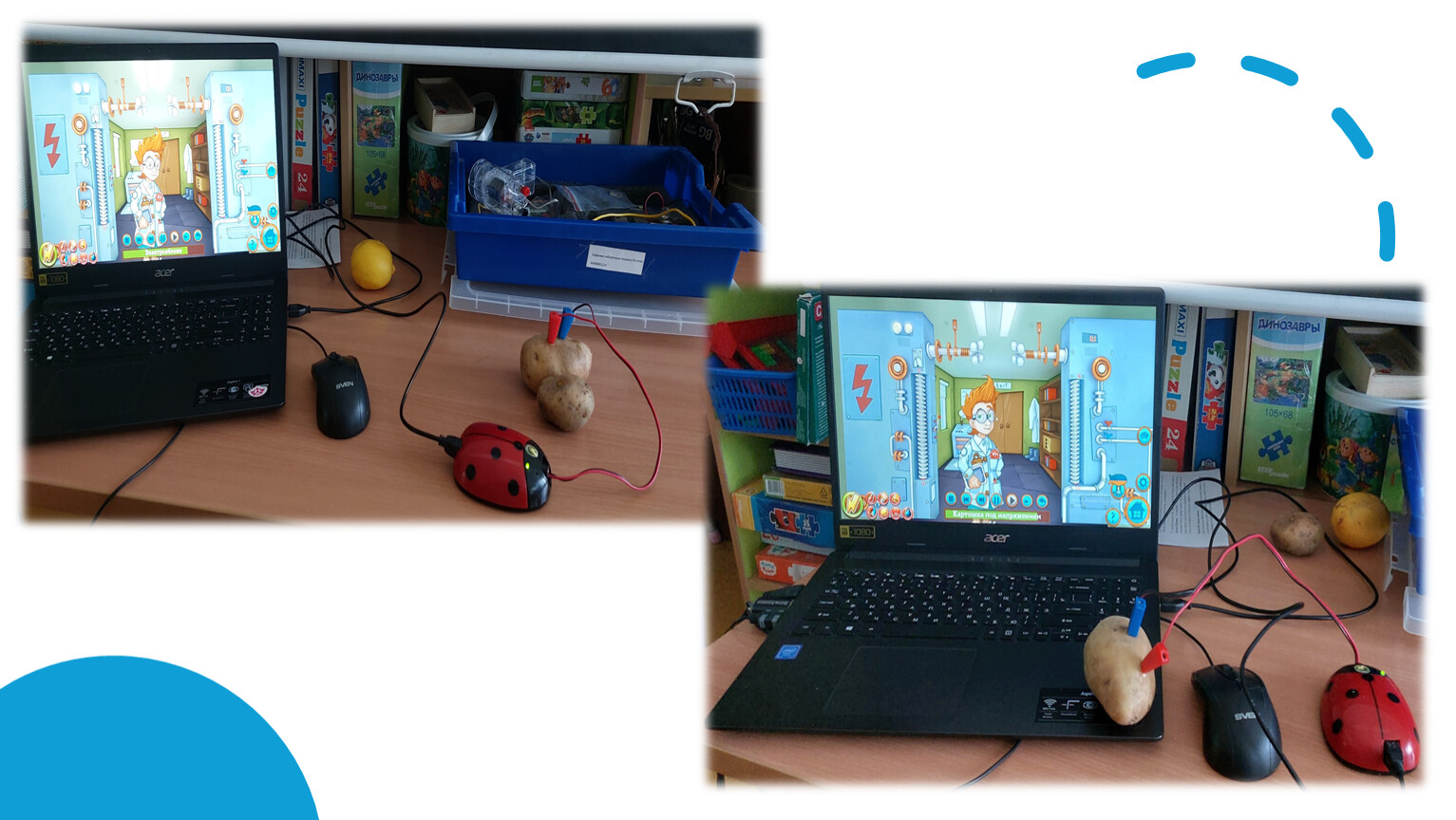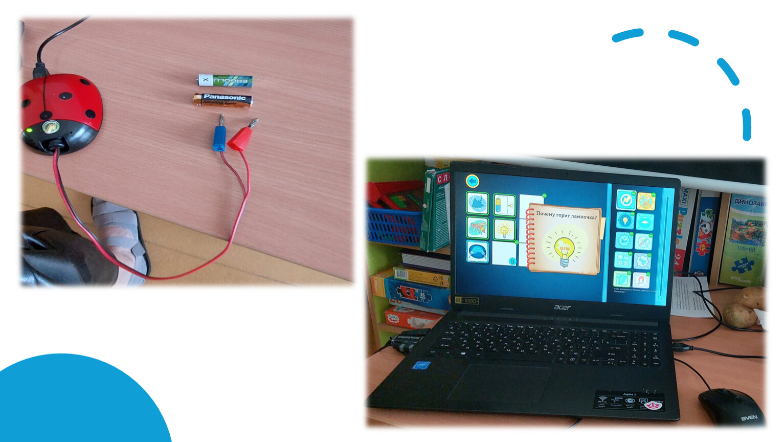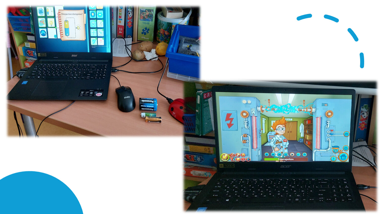 Оборудование: телевизор, ноутбук с приложением «Наураша», датчик «божья коровка» для измерения напряжения, цинковый и медный электроды, динамо-машина, лампочка на платформе, батарейный блок, батарея АА, апельсин, картофель.