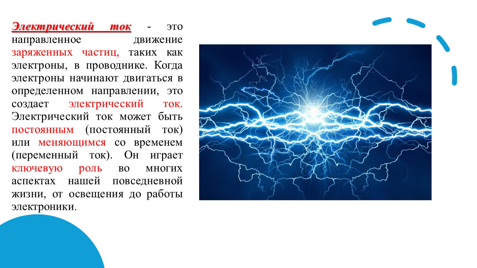 Электрический ток - это направленное движение заряженных частиц, таких как электроны, в проводнике. Когда электроны начинают двигаться в определенном направлении, это создает электрический ток. Электрический ток может быть постоянным (постоянный ток) или меняющимся со временем (переменный ток). Он играет ключевую роль во многих аспектах нашей повседневной жизни, от освещения до работы электроники.