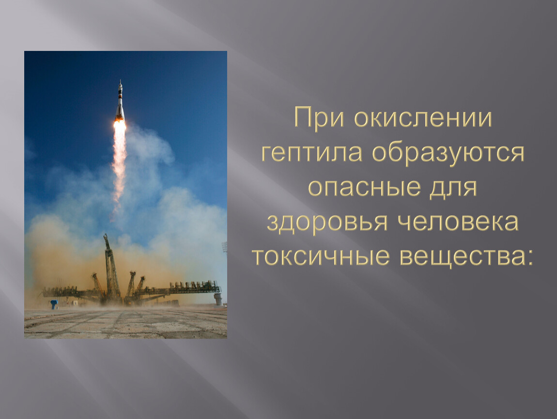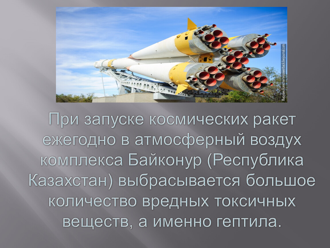 При запуске космических ракет ежегодно в атмосферный воздух комплекса Байконур (Республика Казахстан) выбрасывается большое количество вредных токсичных веществ, а именно гептила.