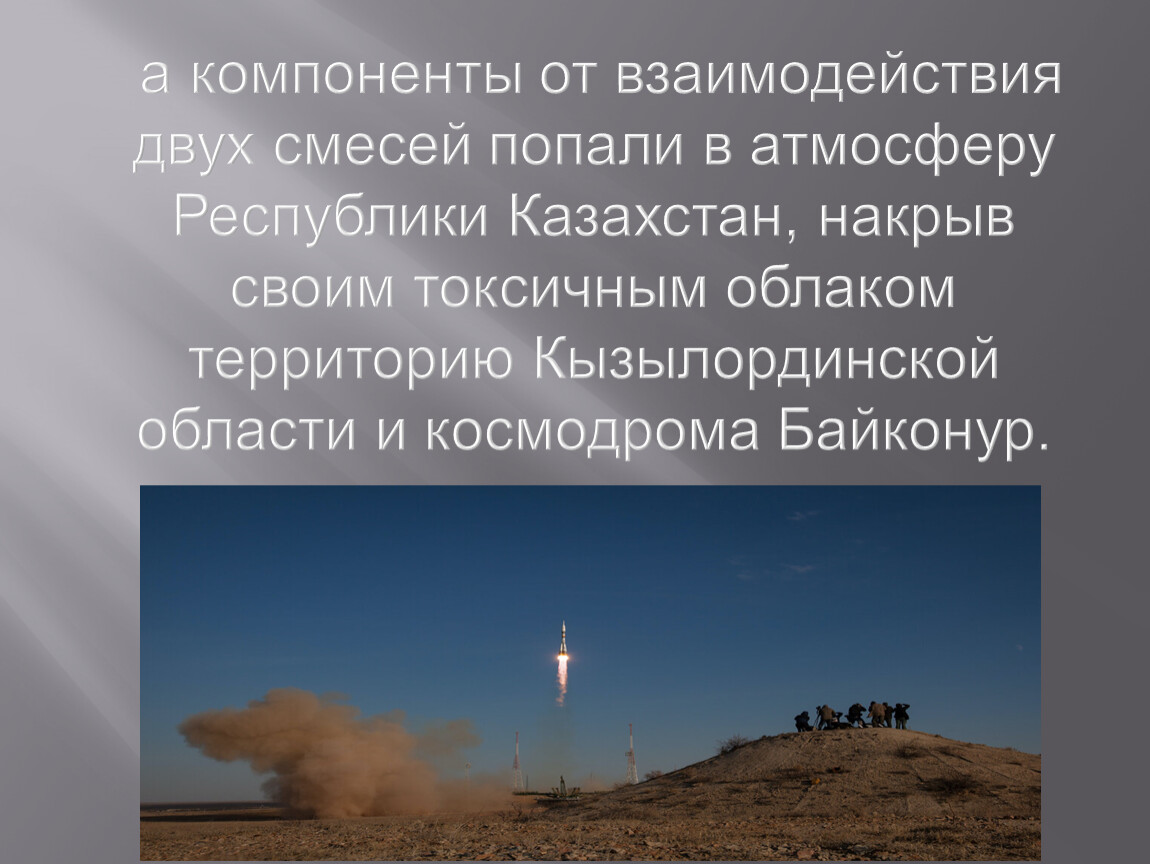 а компоненты от взаимодействия двух смесей попали в атмосферу Республики Казахстан, накрыв своим токсичным облаком территорию Кызылординской области и космодрома Байконур.