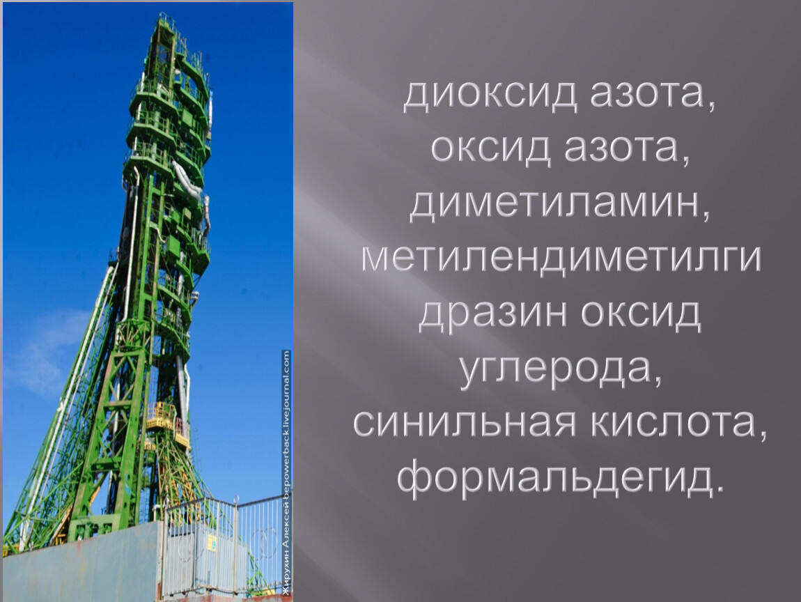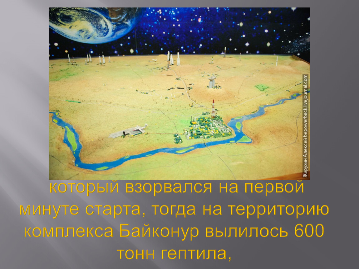 который взорвался на первой минуте старта, тогда на территорию комплекса Байконур вылилось 600 тонн гептила,