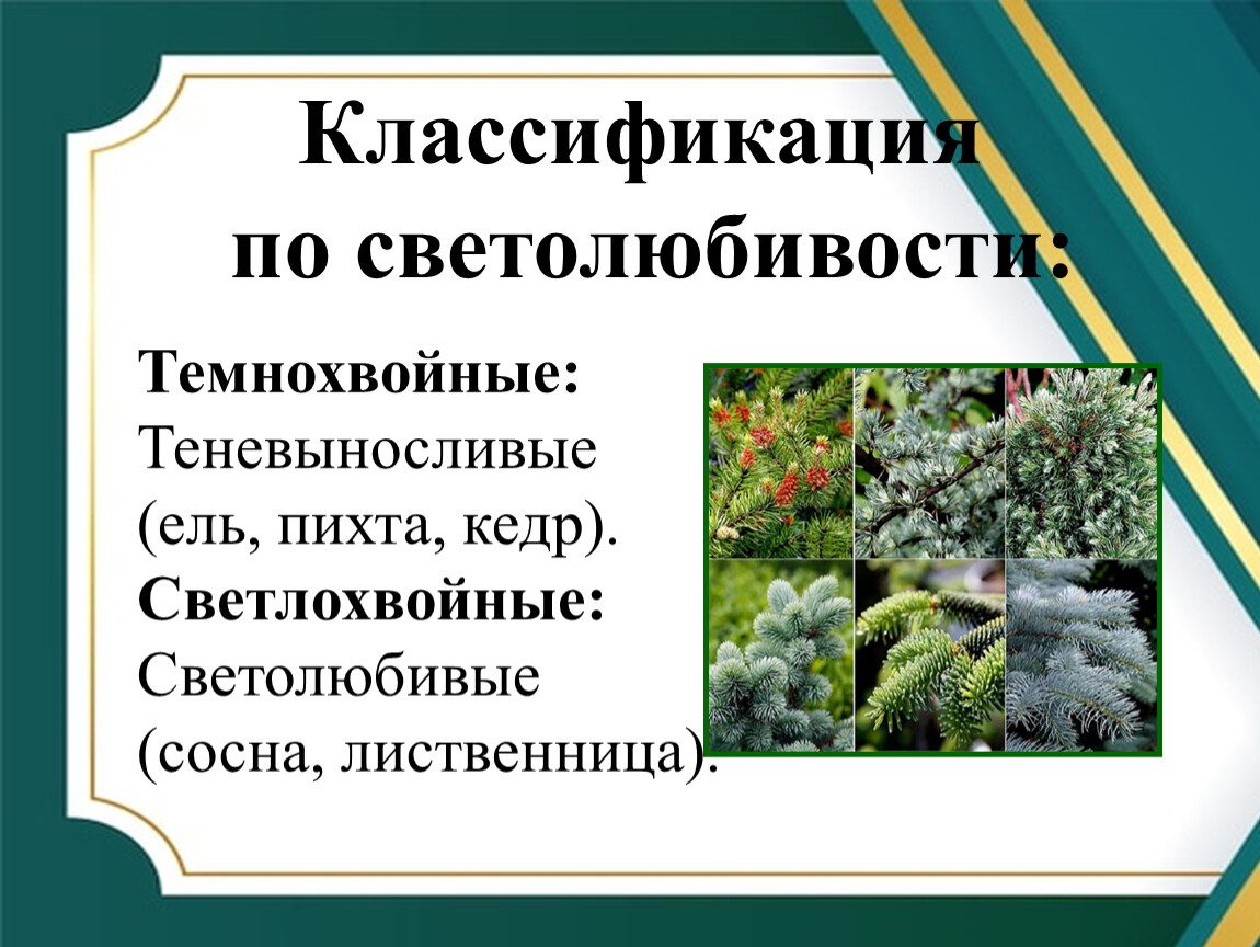 Темнохвойные: Теневыносливые (ель, пихта, кедр).