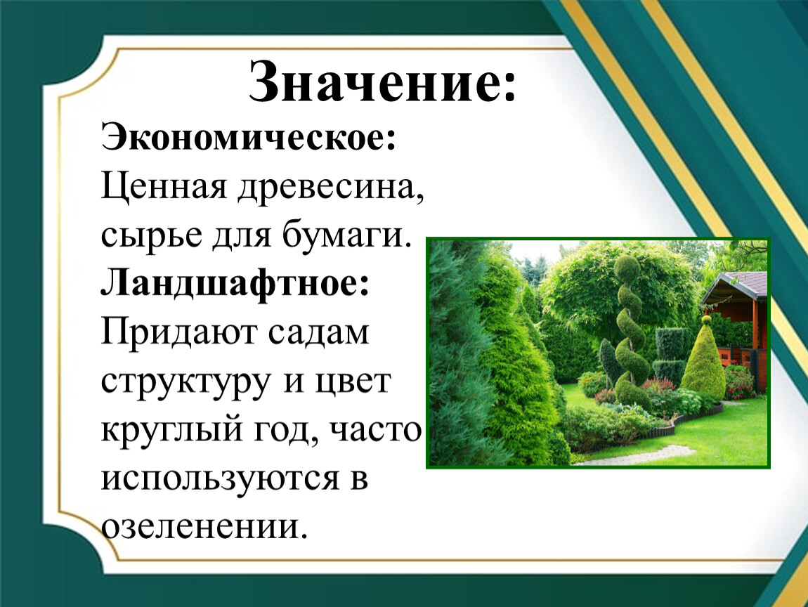 Ландшафтное: Придают садам структуру и цвет круглый год, часто используются в озеленении.