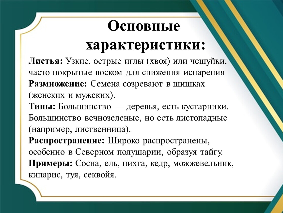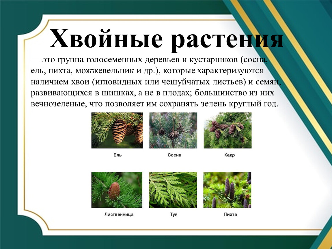 Типы: Большинство — деревья, есть кустарники. Большинство вечнозеленые, но есть листопадные (например, лиственница).