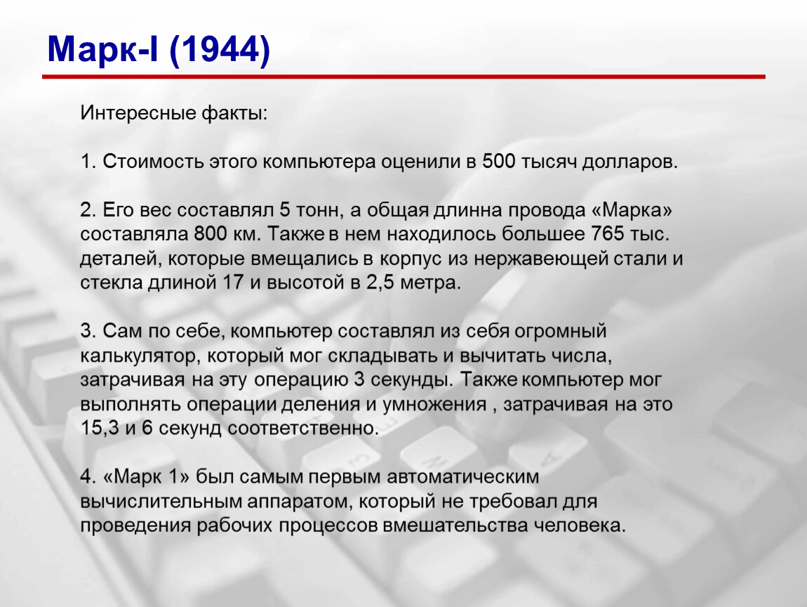 4. «Марк 1» был самым первым автоматическим вычислительным аппаратом, который не требовал для проведения рабочих процессов вмешательства человека.