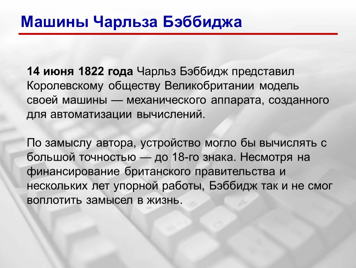 14 июня 1822 года Чарльз Бэббидж представил Королевскому обществу Великобритании модель своей машины — механического аппарата, созданного для автоматизации вычислений.