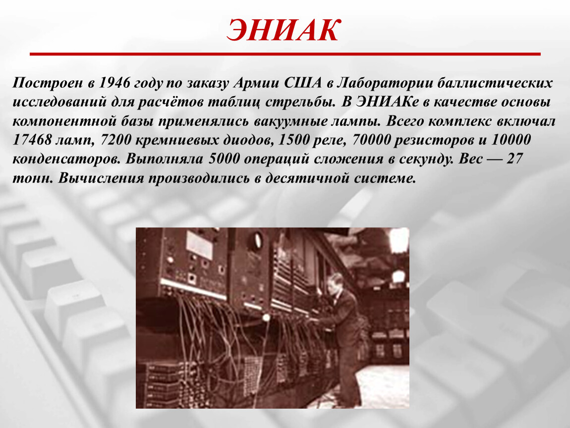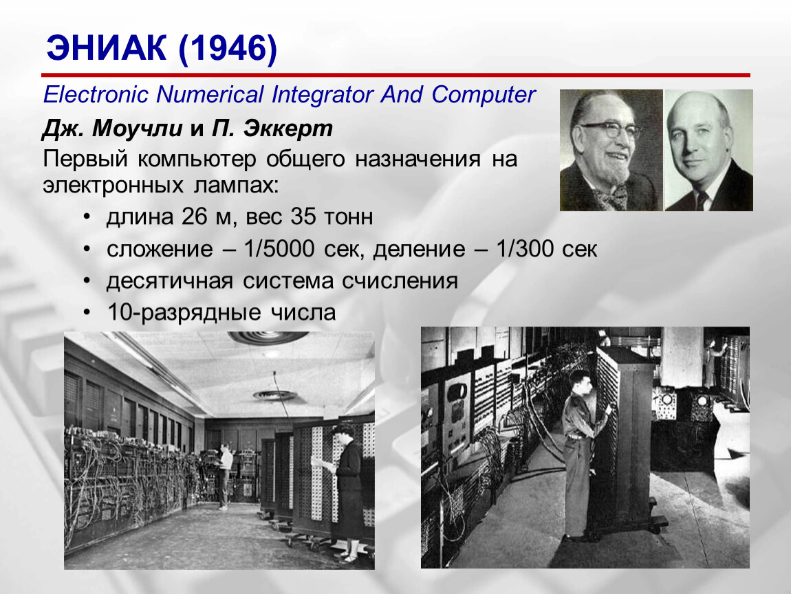 Построен в 1946 году по заказу Армии США в Лаборатории баллистических исследований для расчётов таблиц стрельбы. В ЭНИАКе в качестве основы компонентной базы применялись вакуумные лампы. Всего комплекс включал 17468 ламп, 7200 кремниевых диодов, 1500 реле, 70000 резисторов и 10000 конденсаторов. Выполняла 5000 операций сложения в секунду. Вес — 27 тонн. Вычисления производились в десятичной системе.