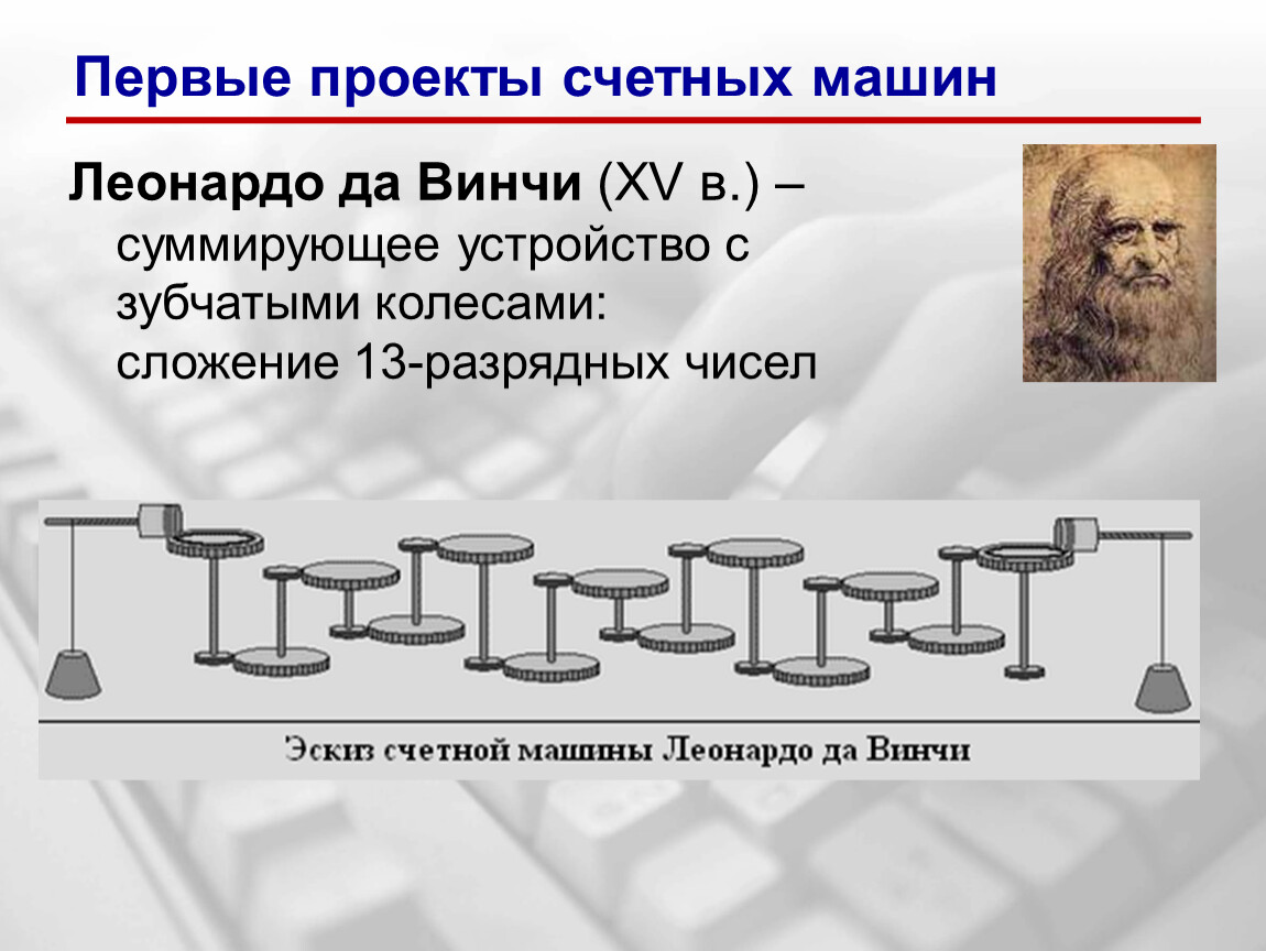 Леонардо да Винчи (XV в.) – суммирующее устройство с зубчатыми колесами: сложение 13-разрядных чисел