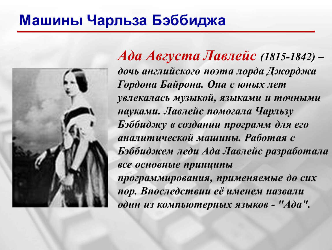 Ада Августа Лавлейс (1815-1842) – дочь английского поэта лорда Джорджа Гордона Байрона. Она с юных лет увлекалась музыкой, языками и точными науками. Лавлейс помогала Чарльзу Бэббиджу в создании программ для его аналитической машины. Работая с Бэббиджем леди Ада Лавлейс разработала все основные принципы программирования, применяемые до сих пор. Впоследствии её именем назвали один из компьютерных языков - "Ада".