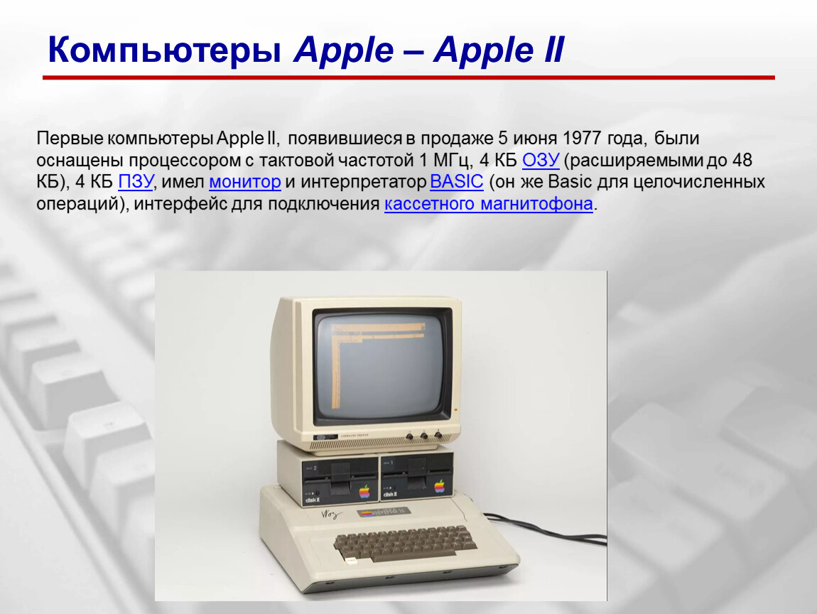 Первые компьютеры Apple II, появившиеся в продаже 5 июня 1977 года, были оснащены процессором с тактовой частотой 1 МГц, 4 КБ ОЗУ (расширяемыми до 48 КБ), 4 КБ ПЗУ, имел монитор и интерпретатор BASIC (он же Basic для целочисленных операций), интерфейс для подключения кассетного магнитофона.