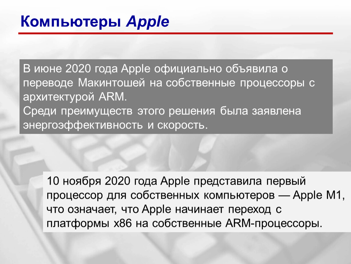 В июне 2020 года Apple официально объявила о переводе Макинтошей на собственные процессоры с архитектурой ARM.