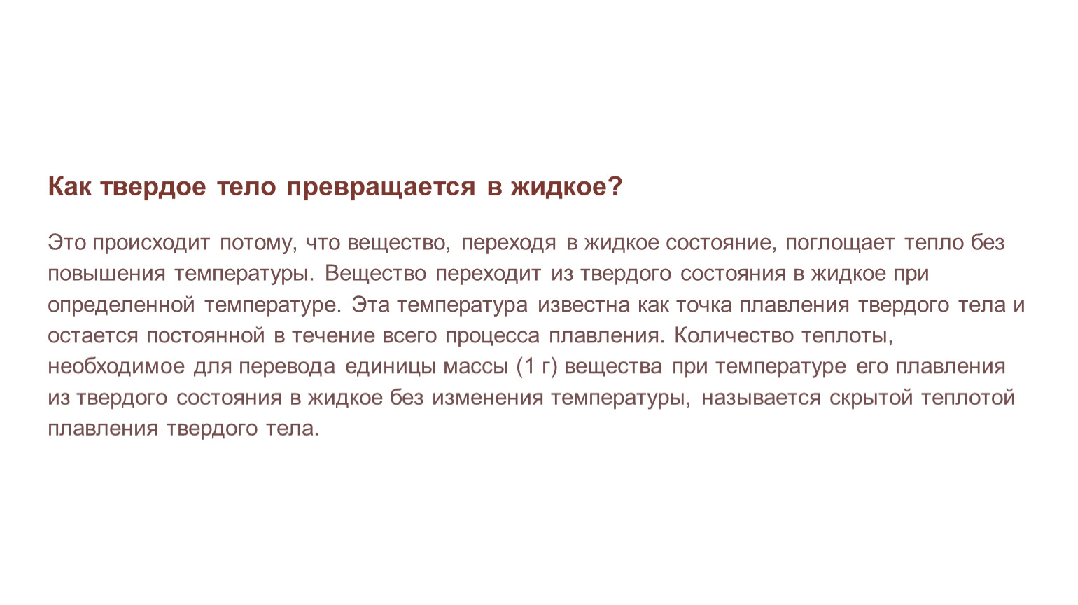 Переход вещества в другую форму называется изменением состояния. Пример: Лед тает в воду при нагревании.