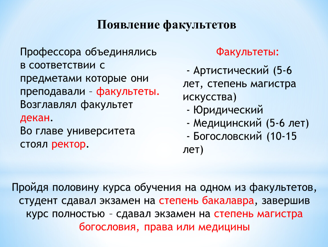 Профессора объединялись в соответствии с предметами которые они преподавали – факультеты.