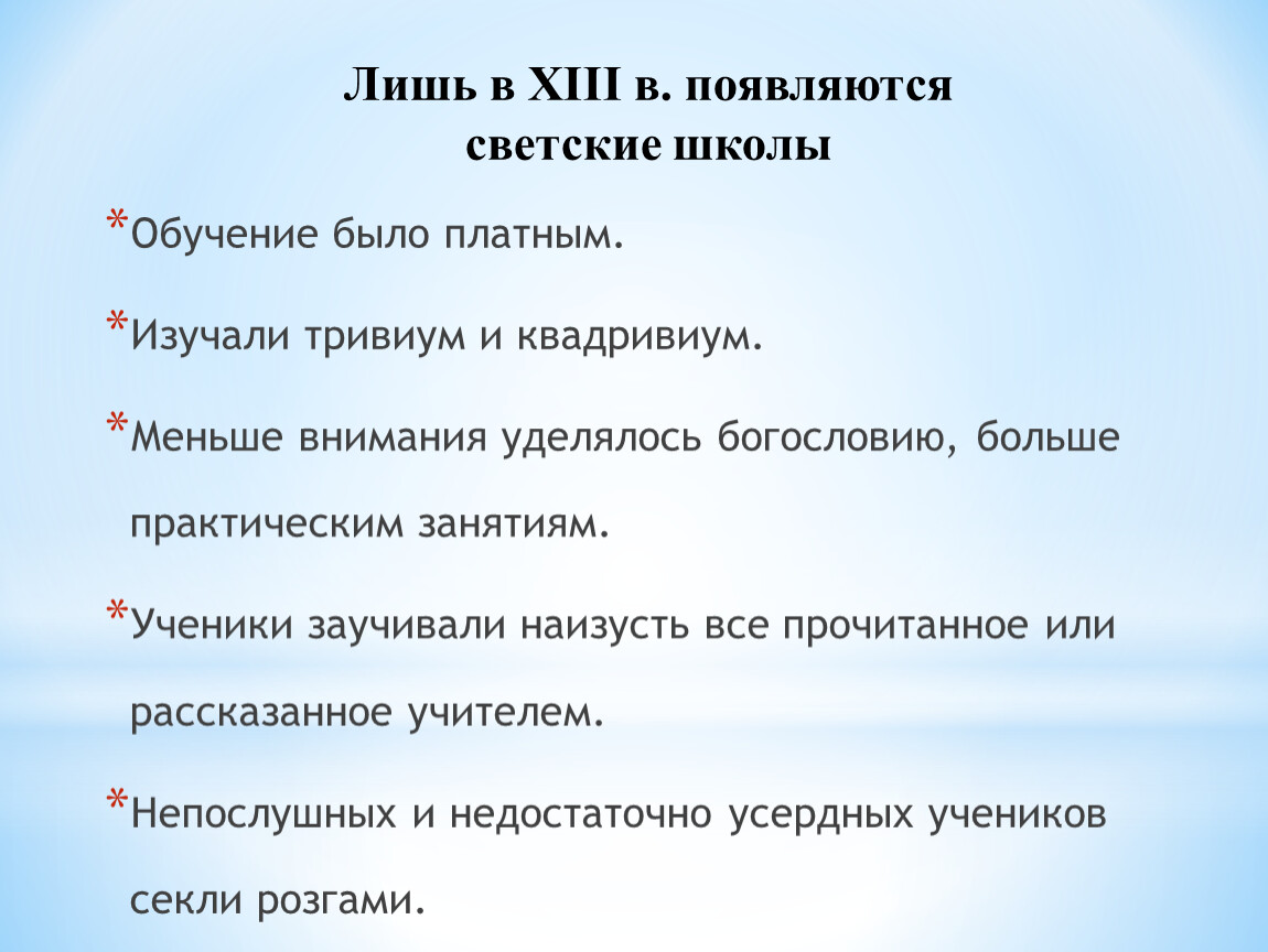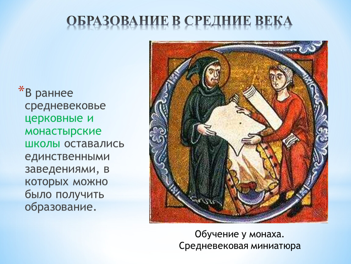 В раннее средневековье церковные и монастырские школы оставались единственными заведениями, в которых можно было получить образование.