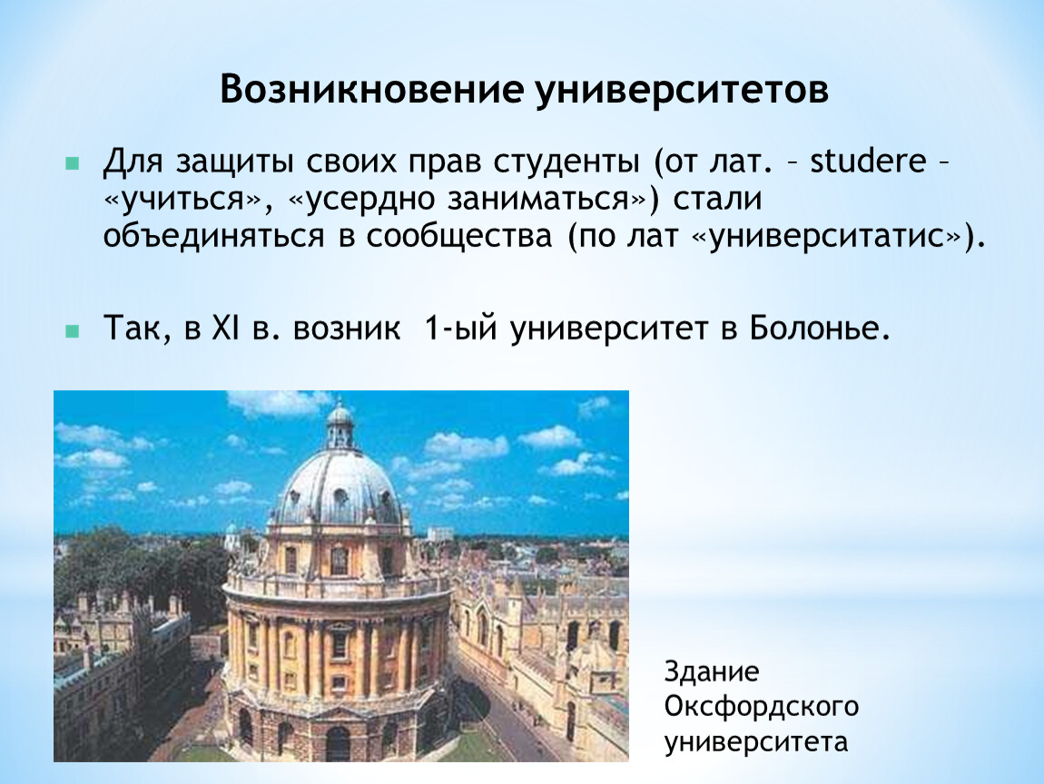 Для защиты своих прав студенты (от лат. – studere – «учиться», «усердно заниматься») стали объединяться в сообщества (по лат «университатис»).