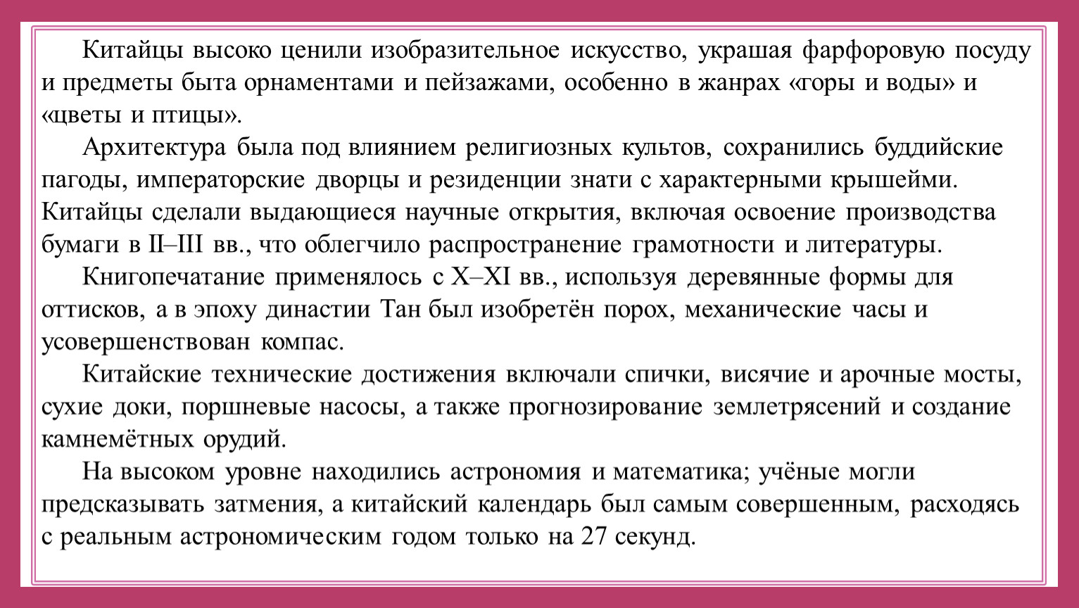 Китайцы сделали выдающиеся научные открытия, включая освоение производства бумаги в II–III вв., что облегчило распространение грамотности и литературы.