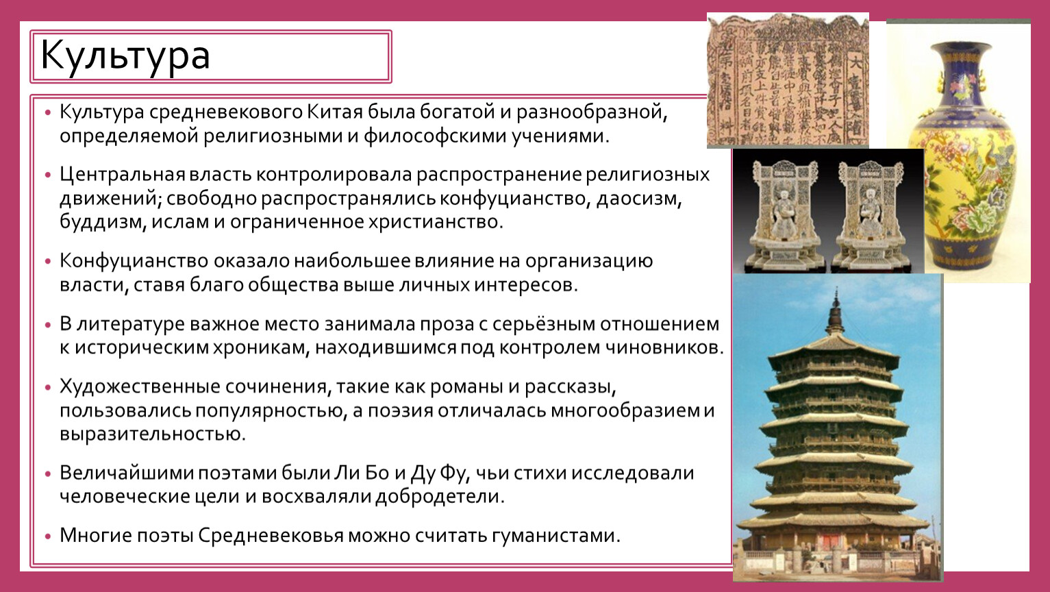 Культура средневекового Китая была богатой и разнообразной, определяемой религиозными и философскими учениями.