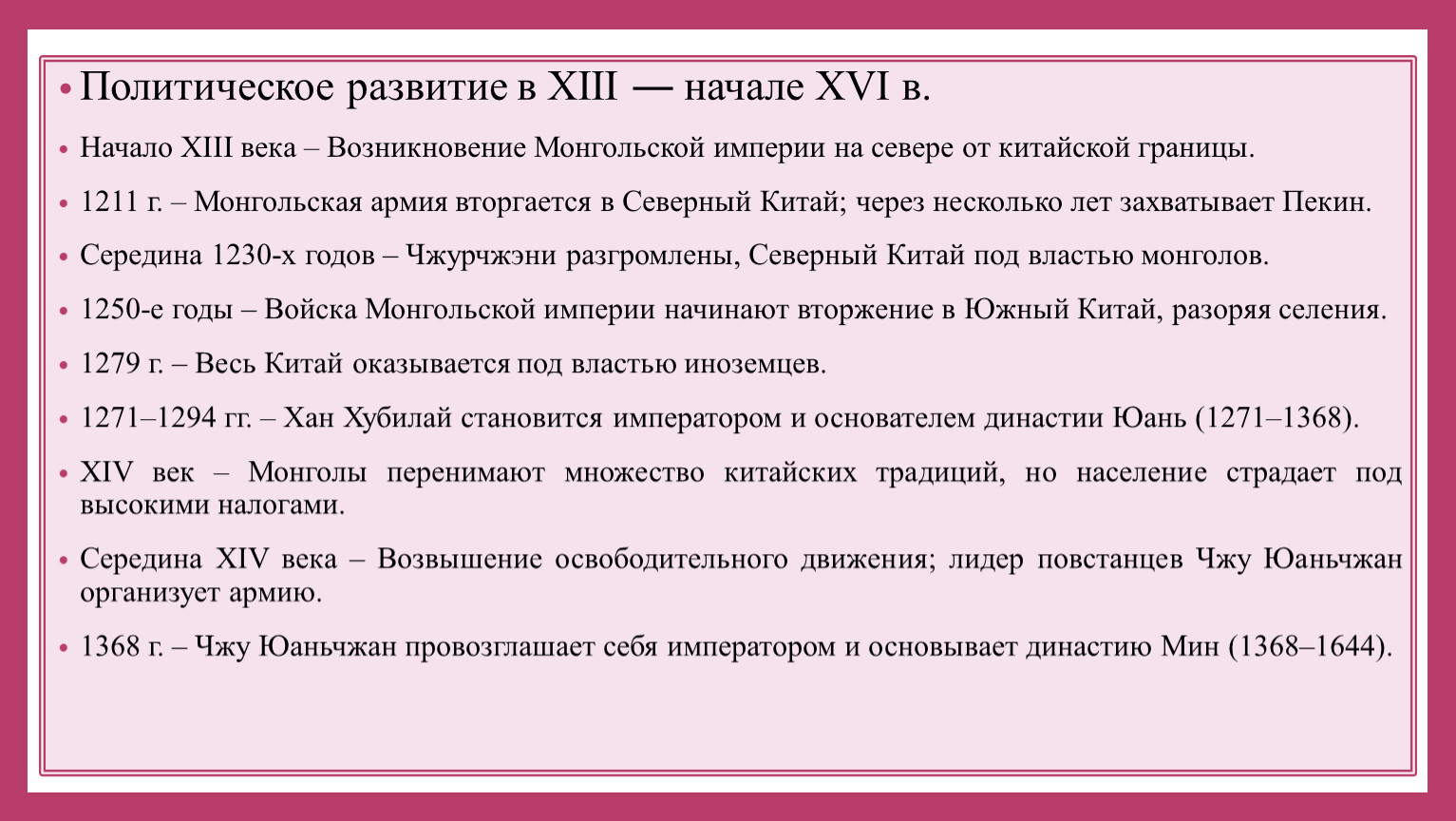 Начало XIII века – Возникновение Монгольской империи на севере от китайской границы.