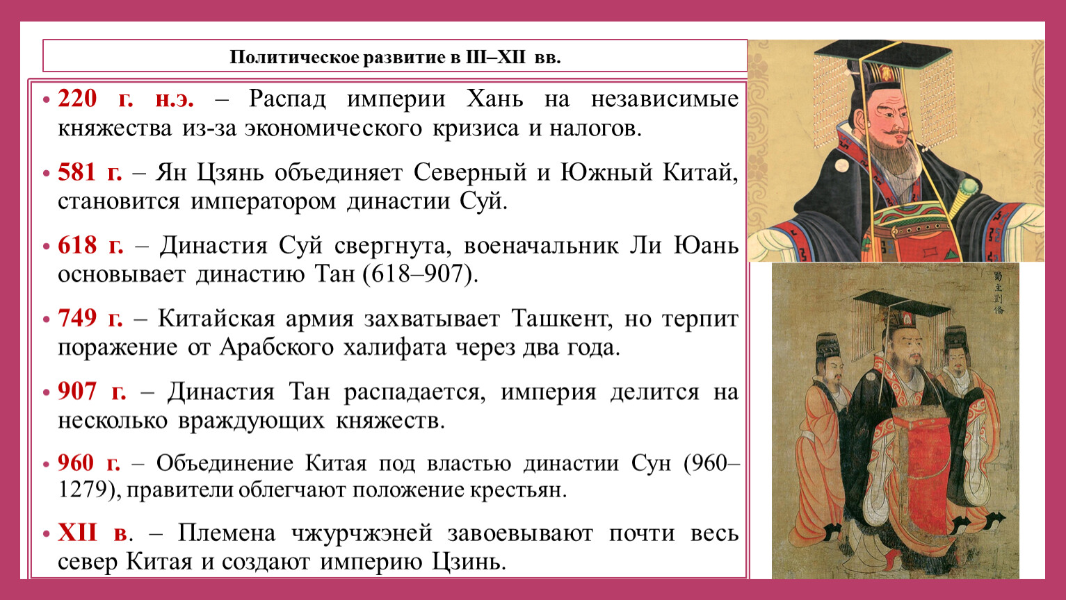 960 г. – Объединение Китая под властью династии Сун (960–1279), правители облегчают положение крестьян.