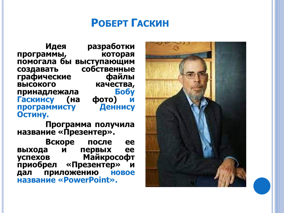 Идея разработки программы, которая помогала бы выступающим создавать собственные графические файлы высокого качества, принадлежала Бобу Гаскинсу (на фото) и программисту Деннису Остину.