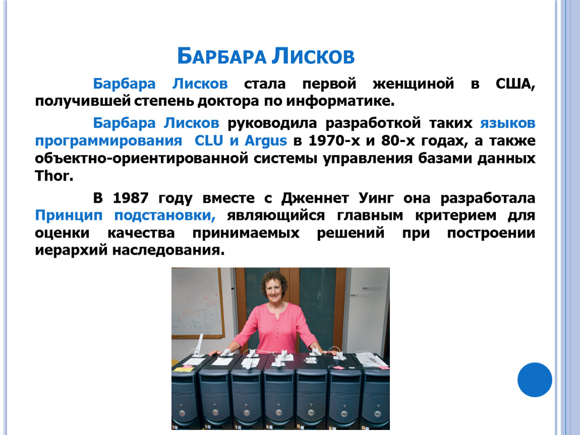 Барбара Лисков руководила разработкой таких языков программирования CLU и Argus в 1970-х и 80-х годах, а также объектно-ориентированной системы управления базами данных Thor.