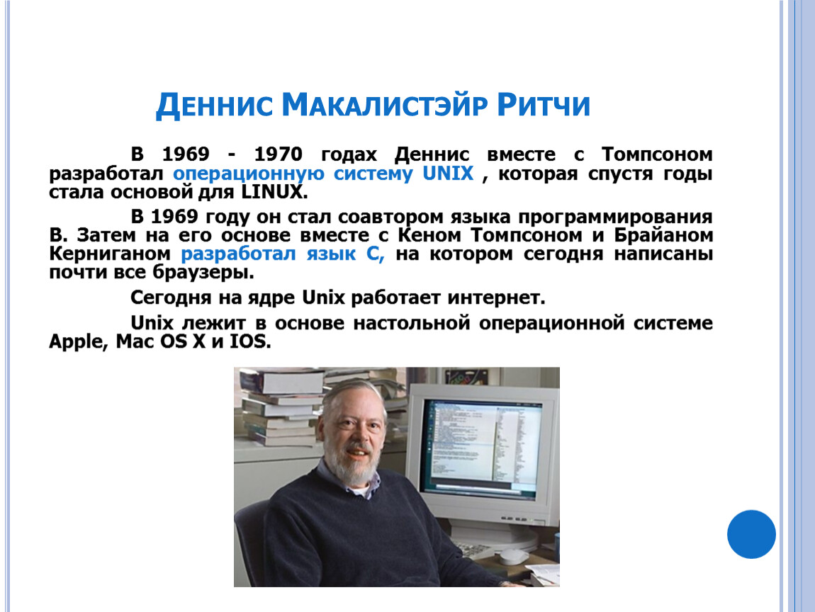 В 1969 - 1970 годах Деннис вместе с Томпсоном разработал операционную систему UNIX , которая спустя годы стала основой для LINUX.